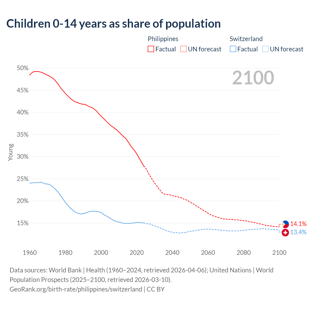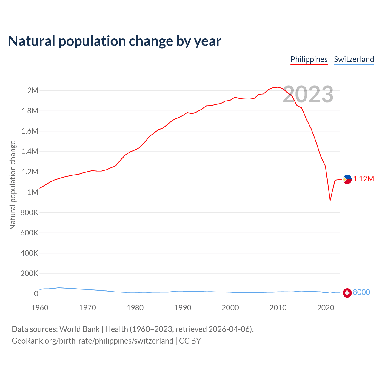 According to the latest available data on birth rates, the fertility rate in the Philippines was 1.92 children per woman in 2023, compared to 1.33 in Switzerland in 2023. The replacement level is considered to be 2.1 children per woman.