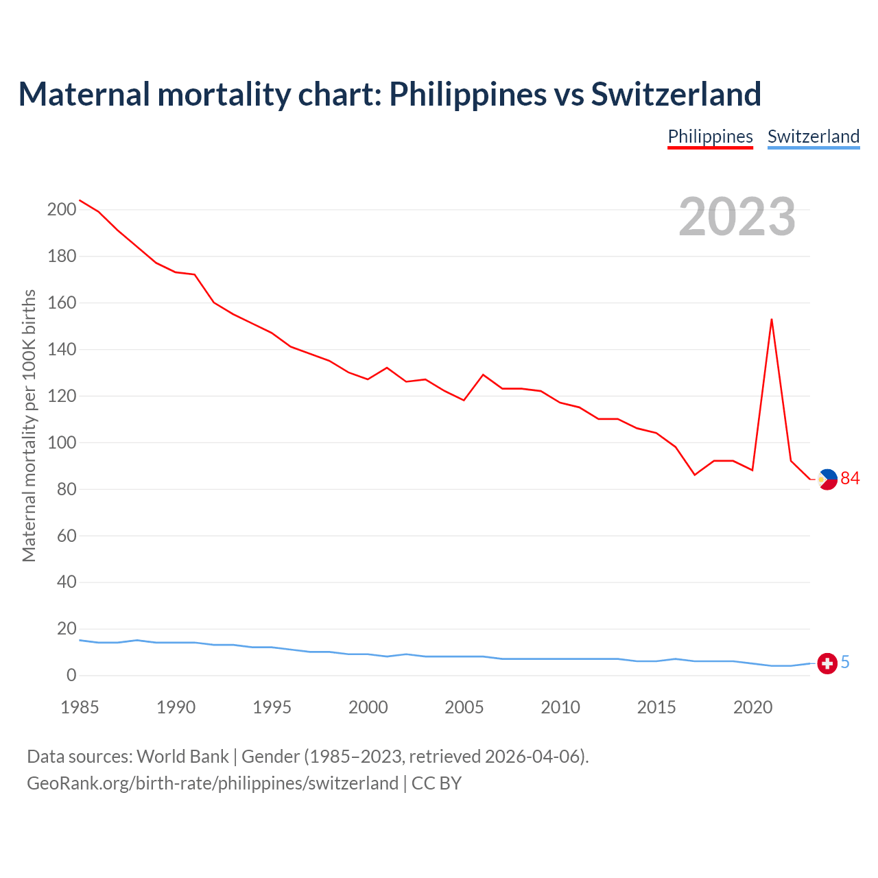 The maternal mortality rate, which is the probability of dying during childbirth or within 42 days of pregnancy termination, is 84 deaths per 100,000 live births in the Philippines, compared to 5 deaths in Switzerland.