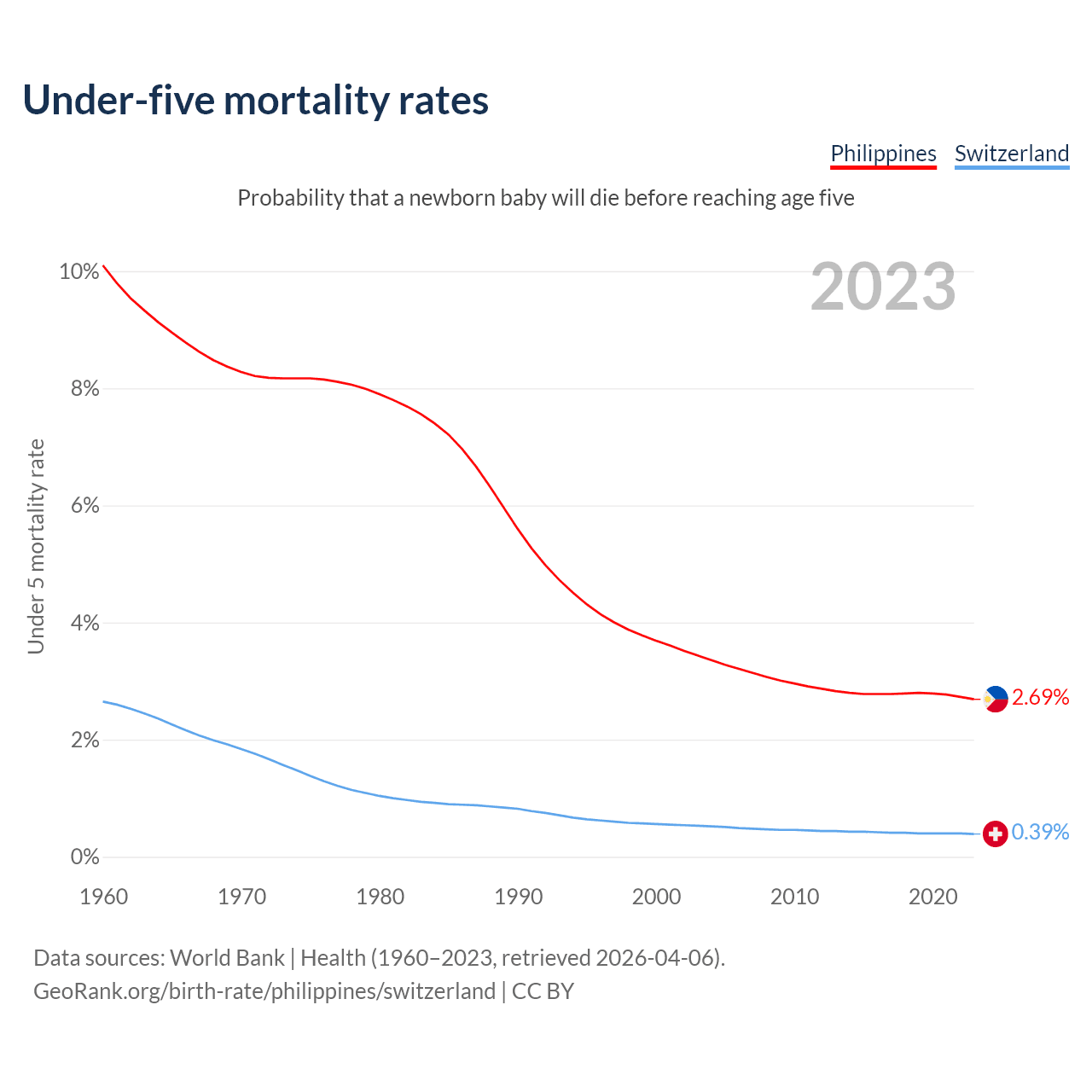 The chance that a newborn baby will die before reaching age five is 2.69% in the Philippines and 0.39% in Switzerland. Above is a chart with historical data on under-five mortality rates.