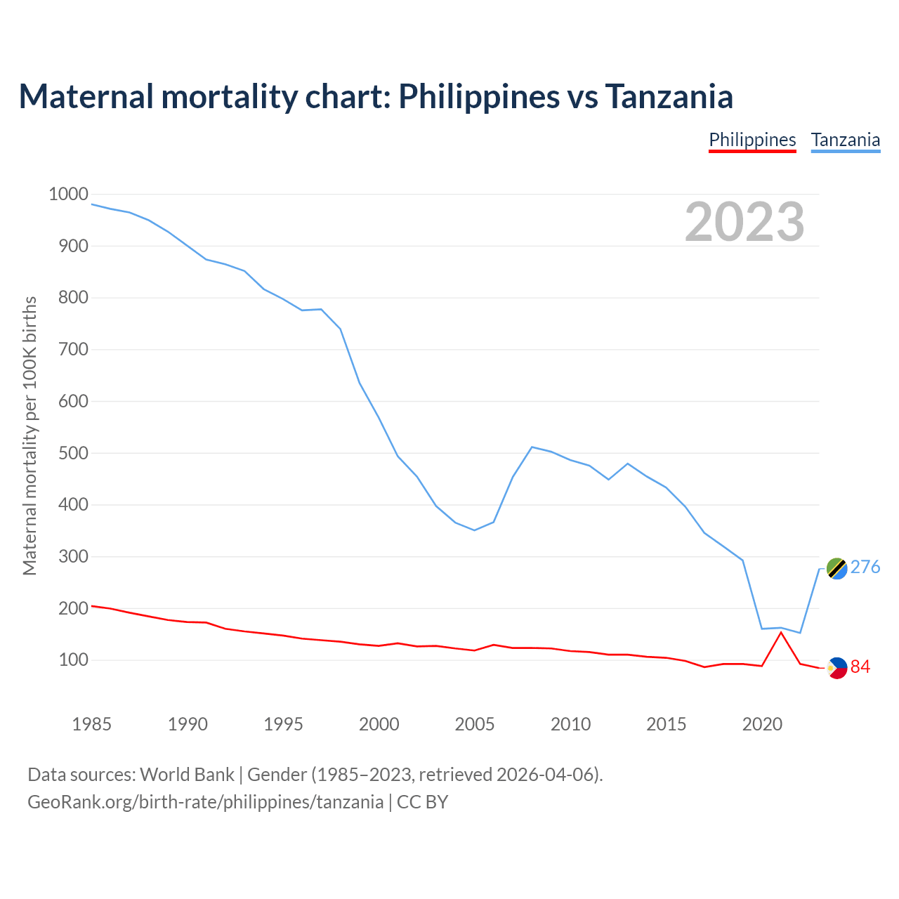The maternal mortality rate, which is the probability of dying during childbirth or within 42 days of pregnancy termination, is 84 deaths per 100,000 live births in the Philippines, compared to 276 deaths in Tanzania.