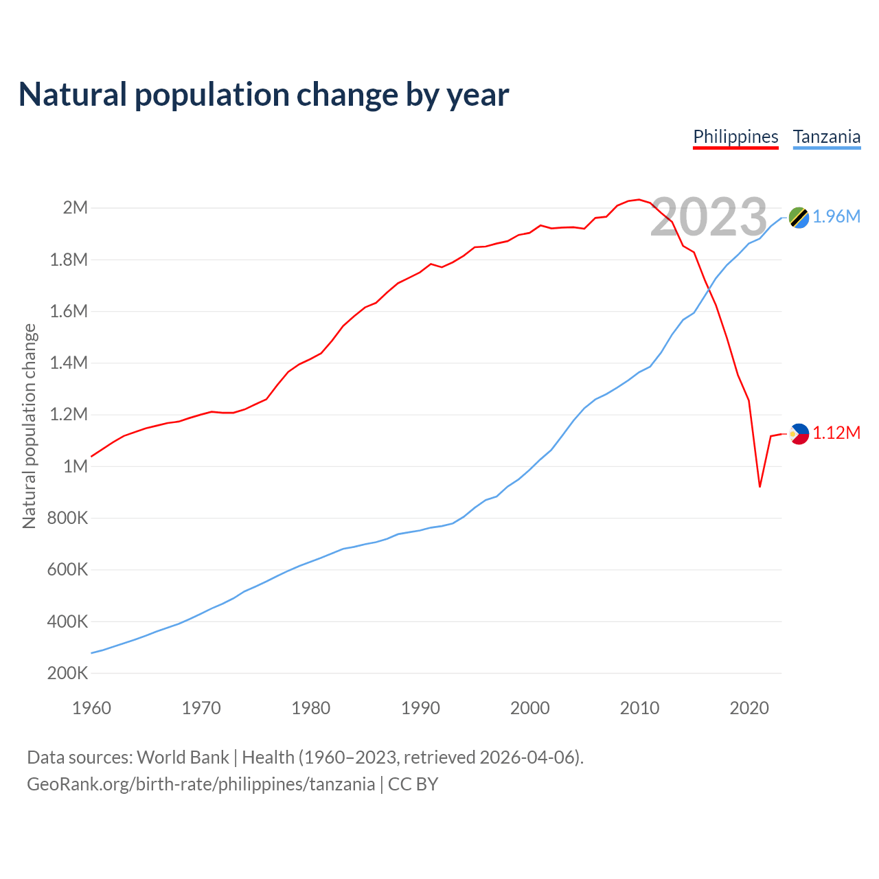 According to the latest available data on birth rates, the fertility rate in the Philippines was 1.92 children per woman in 2023, compared to 4.61 in Tanzania in 2023. The replacement level is considered to be 2.1 children per woman.