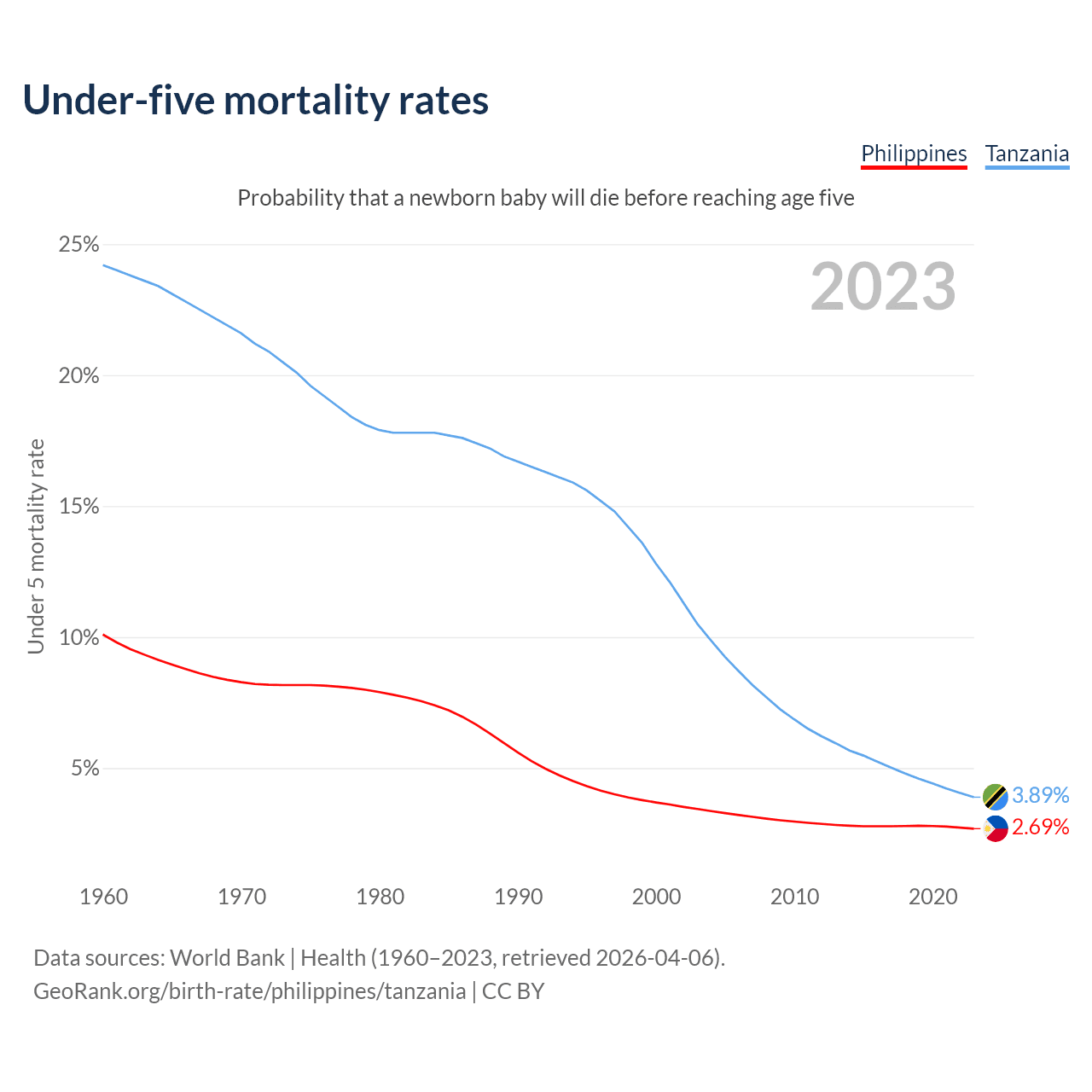 The chance that a newborn baby will die before reaching age five is 2.69% in the Philippines and 3.89% in Tanzania. Above is a chart with historical data on under-five mortality rates.