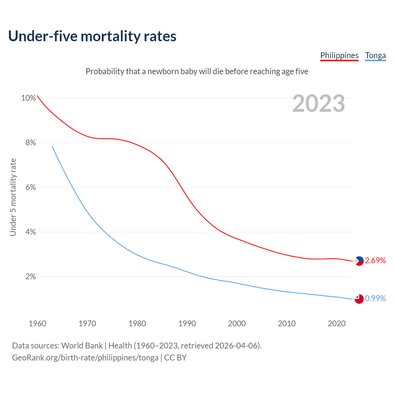 The chance that a newborn baby will die before reaching age five is 2.69% in the Philippines and 0.99% in Tonga. Above is a chart with historical data on under-five mortality rates.