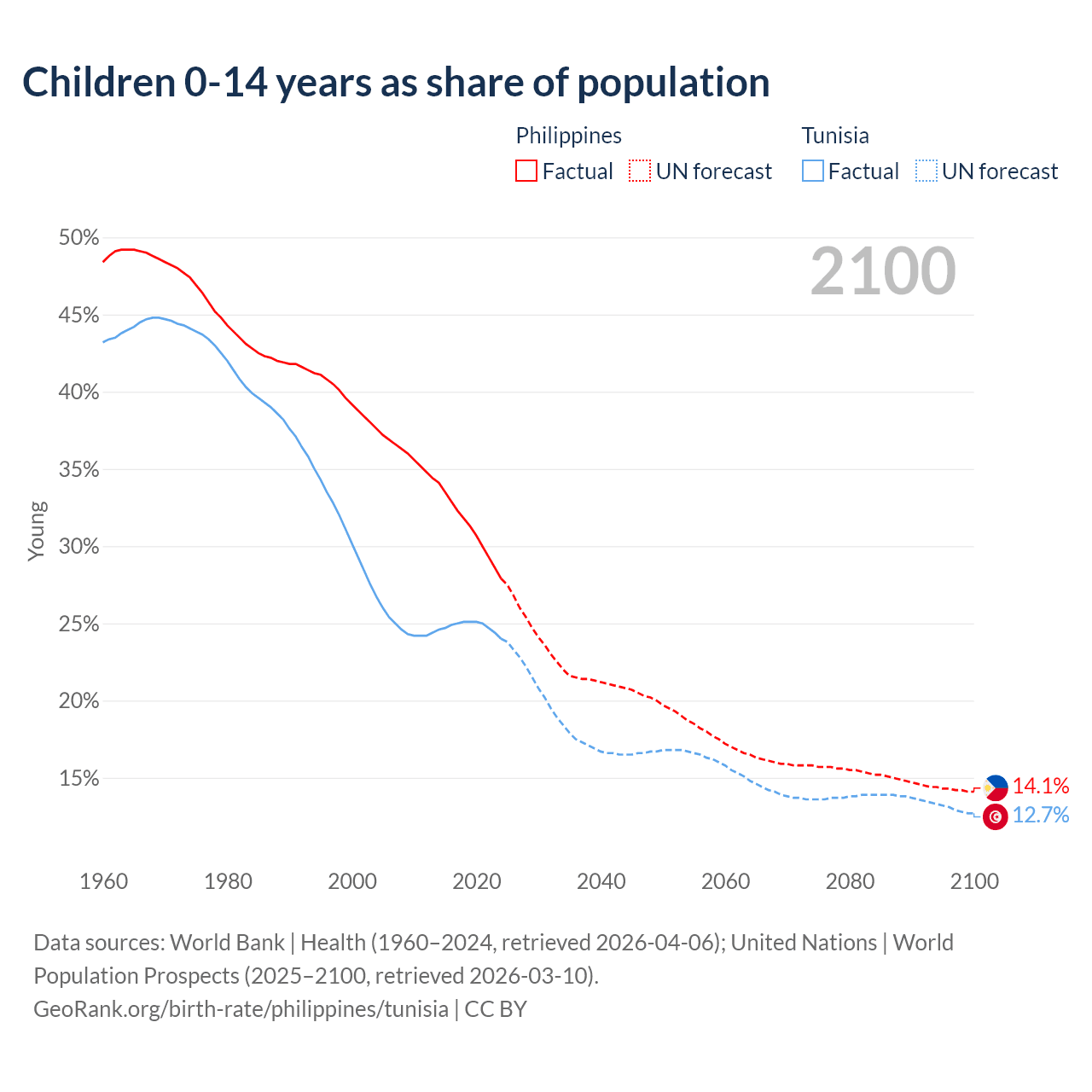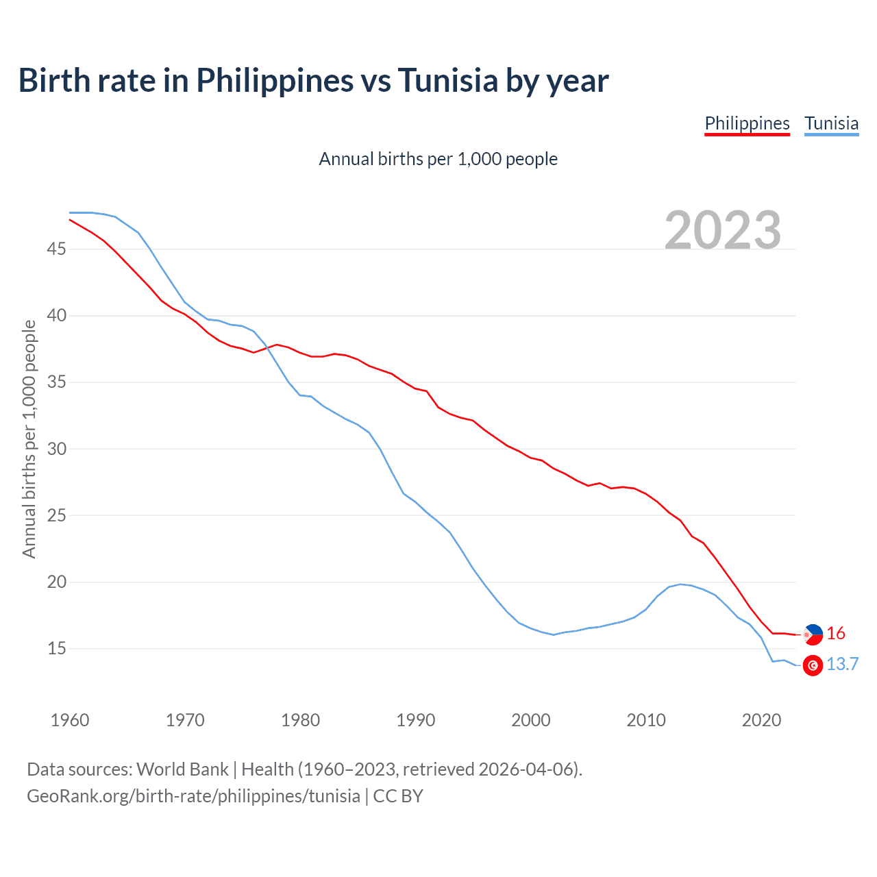 The Philippines has an annual birth rate of 16 births per 1,000 people, compared to 13.7 for Tunisia. The average number of children a woman is expected to have during her lifetime — the fertility rate, is 1.92 in the Philippines and 1.83 in Tunisia — 4.38% difference.