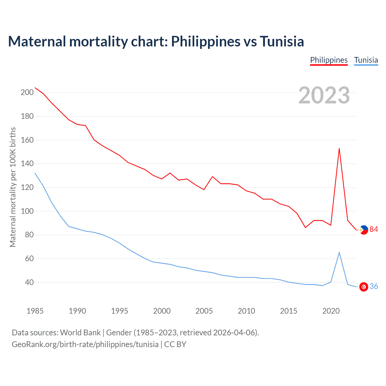 The maternal mortality rate, which is the probability of dying during childbirth or within 42 days of pregnancy termination, is 84 deaths per 100,000 live births in the Philippines, compared to 36 deaths in Tunisia.