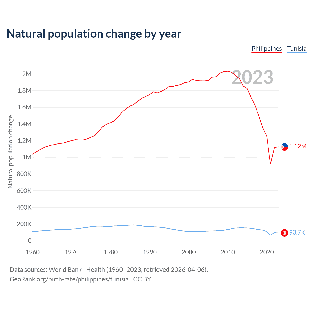 According to the latest available data on birth rates, the fertility rate in the Philippines was 1.92 children per woman in 2023, compared to 1.83 in Tunisia in 2023. The replacement level is considered to be 2.1 children per woman.