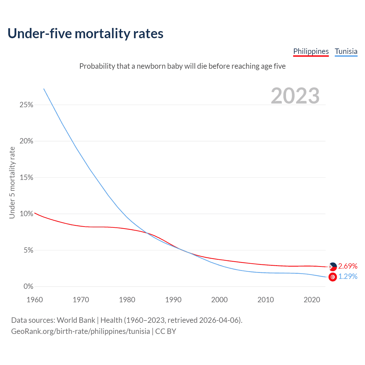 The chance that a newborn baby will die before reaching age five is 2.69% in the Philippines and 1.29% in Tunisia. Above is a chart with historical data on under-five mortality rates.