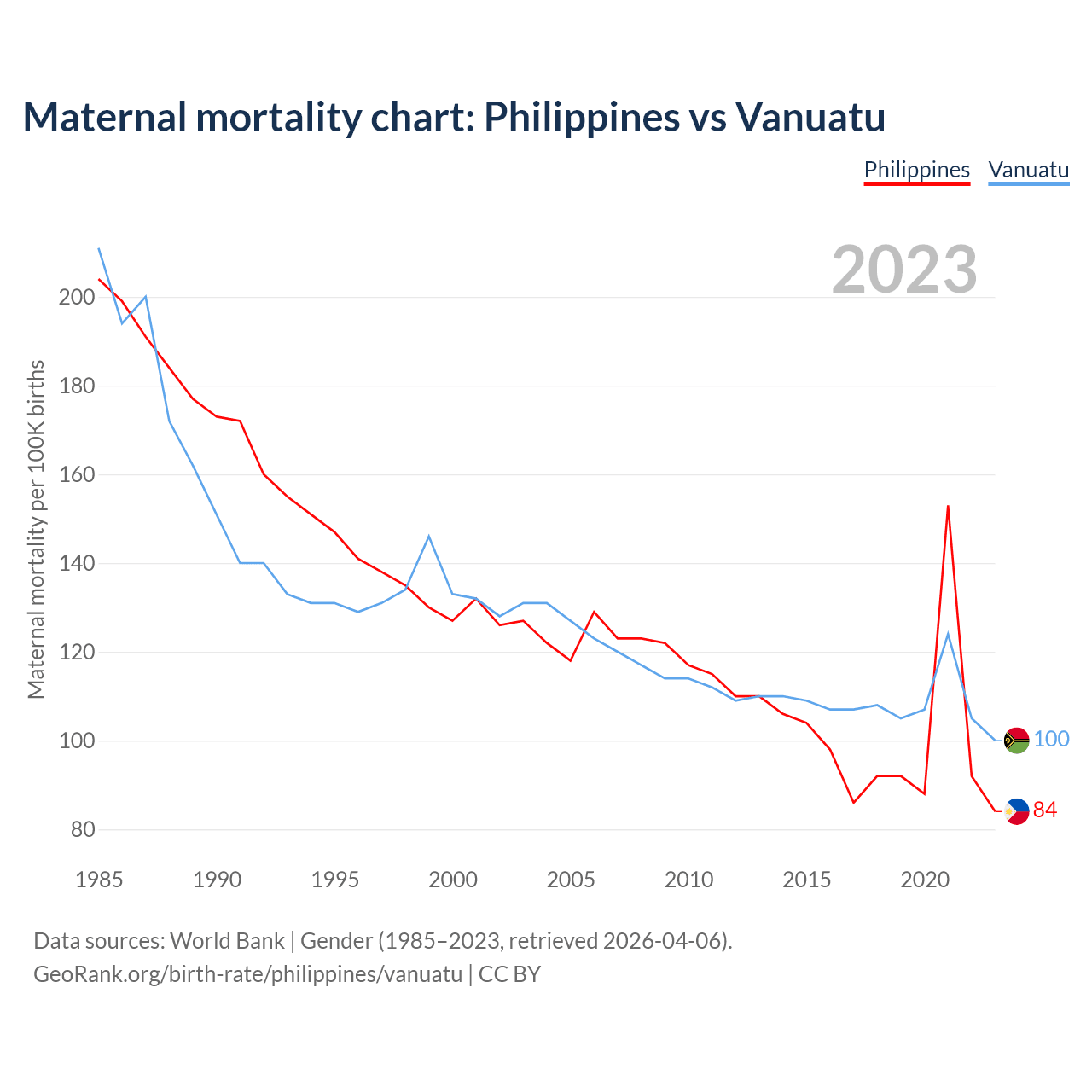 The maternal mortality rate, which is the probability of dying during childbirth or within 42 days of pregnancy termination, is 84 deaths per 100,000 live births in the Philippines, compared to 100 deaths in Vanuatu.