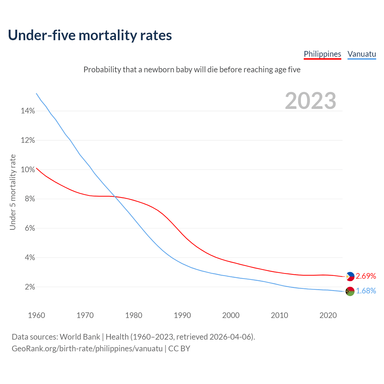 The chance that a newborn baby will die before reaching age five is 2.69% in the Philippines and 1.68% in Vanuatu. Above is a chart with historical data on under-five mortality rates.