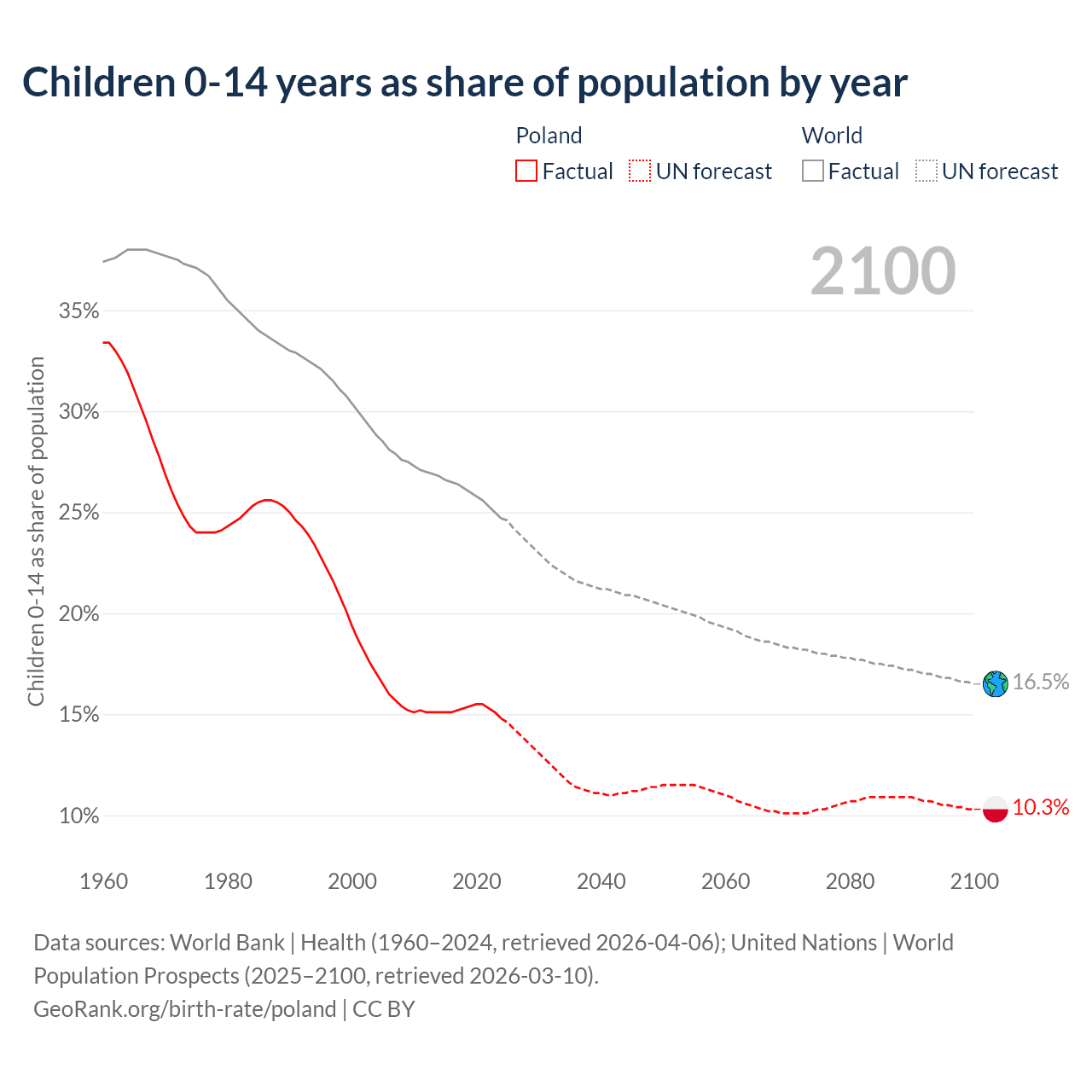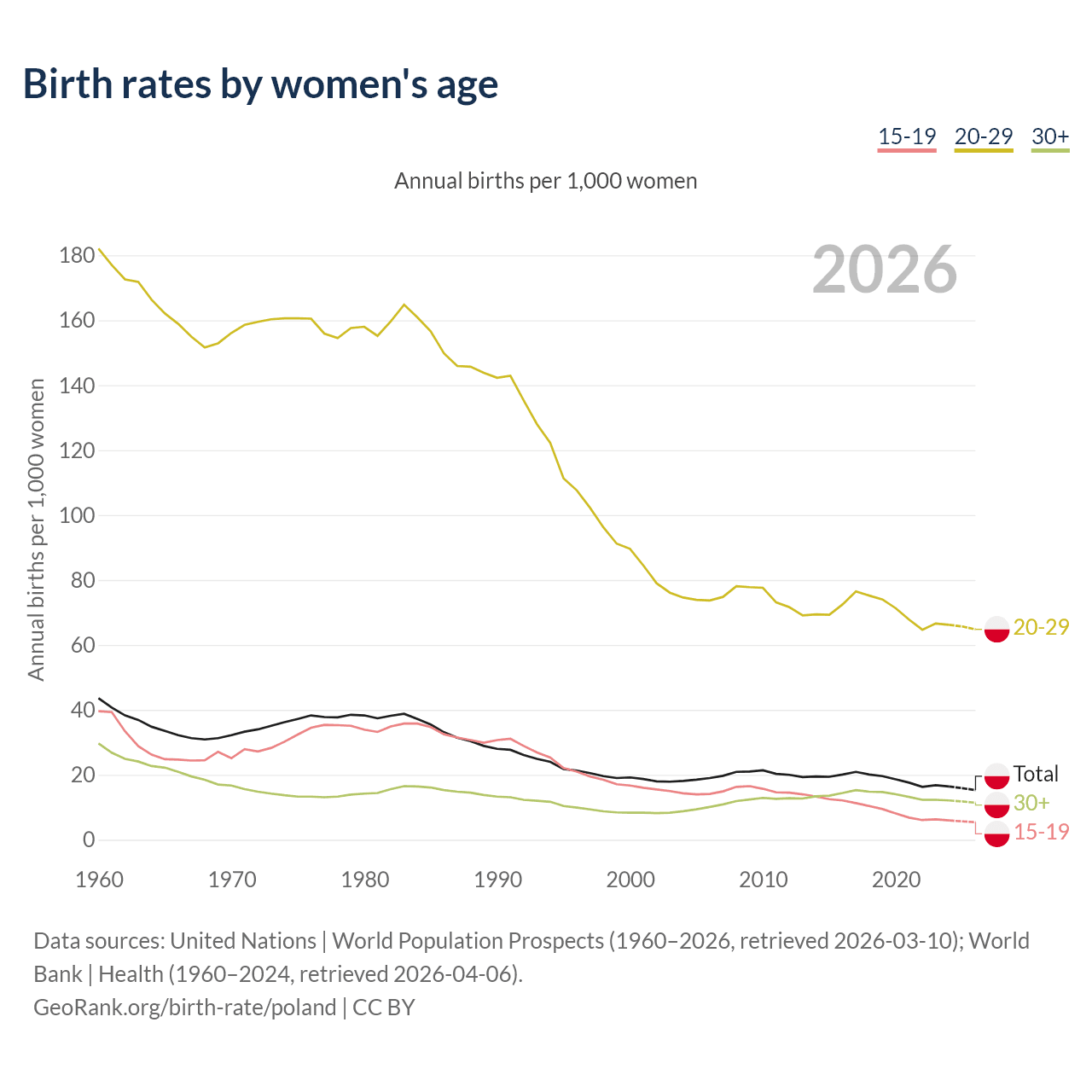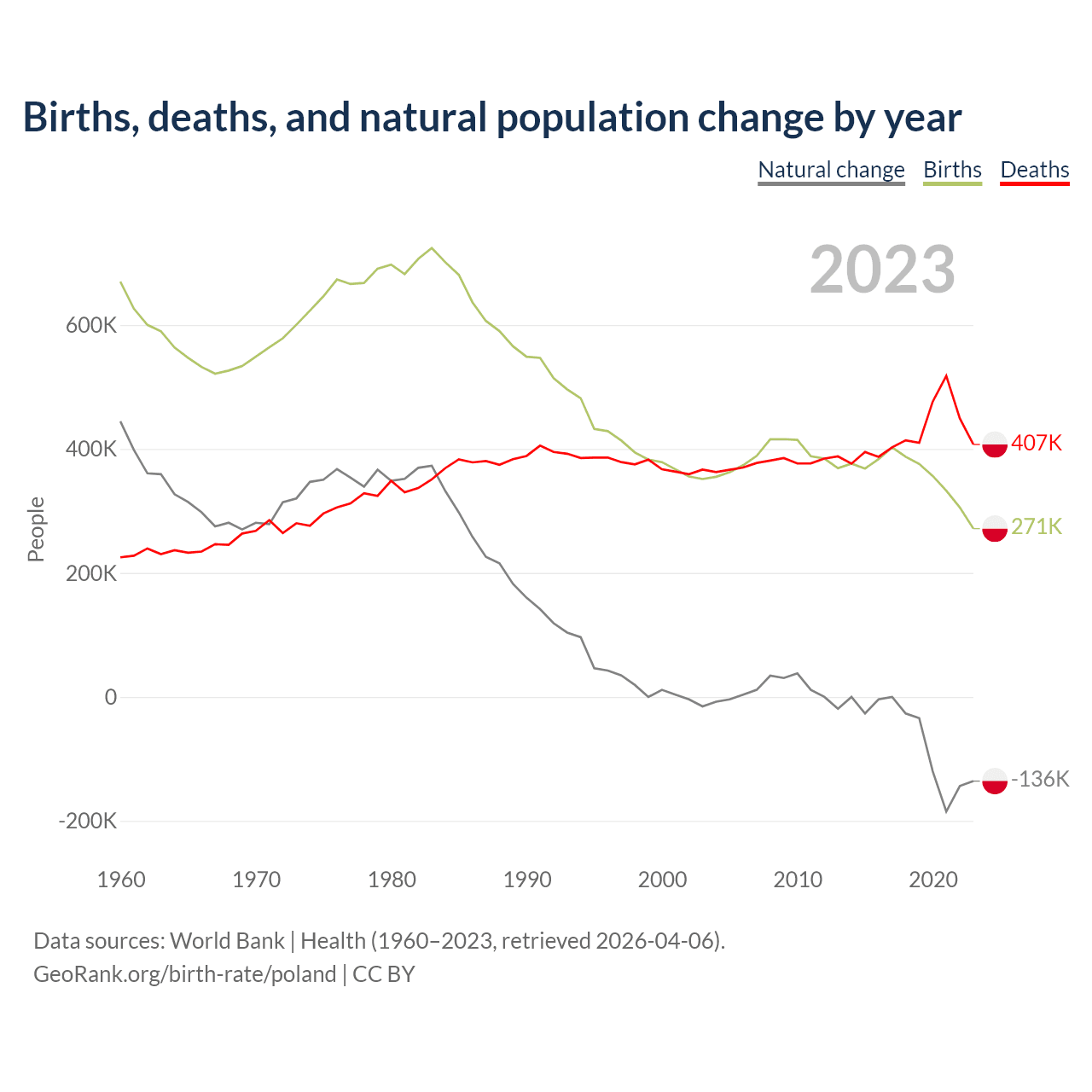 According to the latest birth rate data available, the fertility rate in Poland was 1.16 in 2023 and has been below the replacement level of 2.1 children per woman since 1989. In 1993, the fertility rate was 1.87 — a 38.1% decline in 30 years.