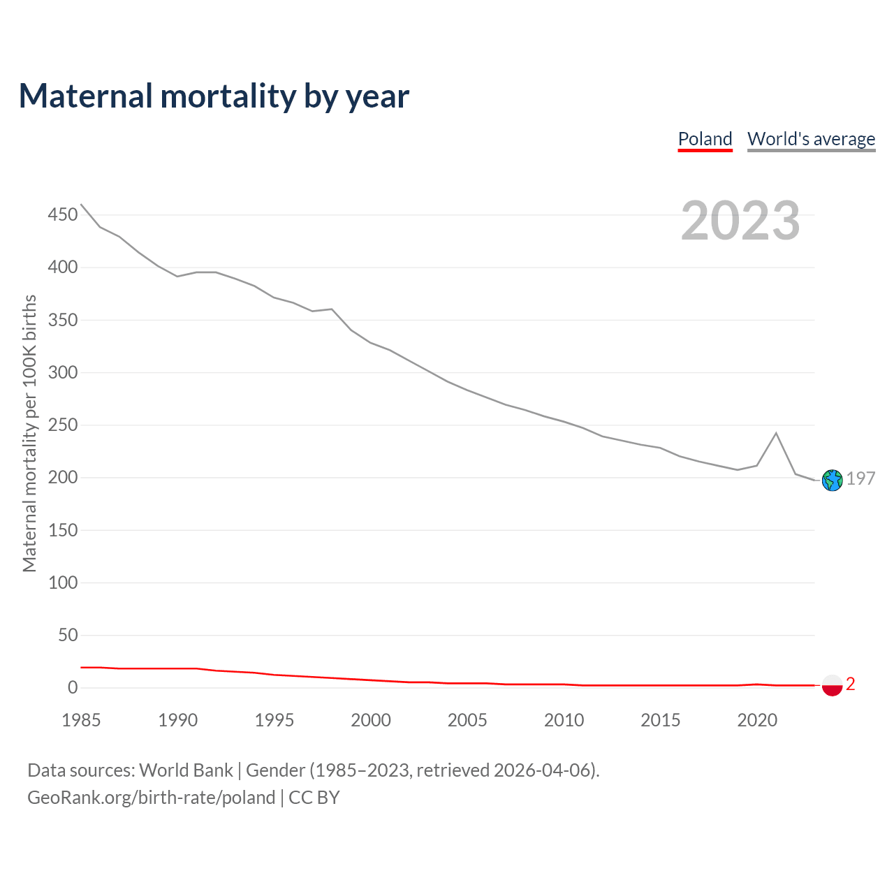 The maternal mortality rate in Poland was 2 deaths per 100,000 live births in 2023 — a 0.002% chance of dying during childbirth or within 42 days of pregnancy termination. This is a 71.4% decrease compared to the year 2000.