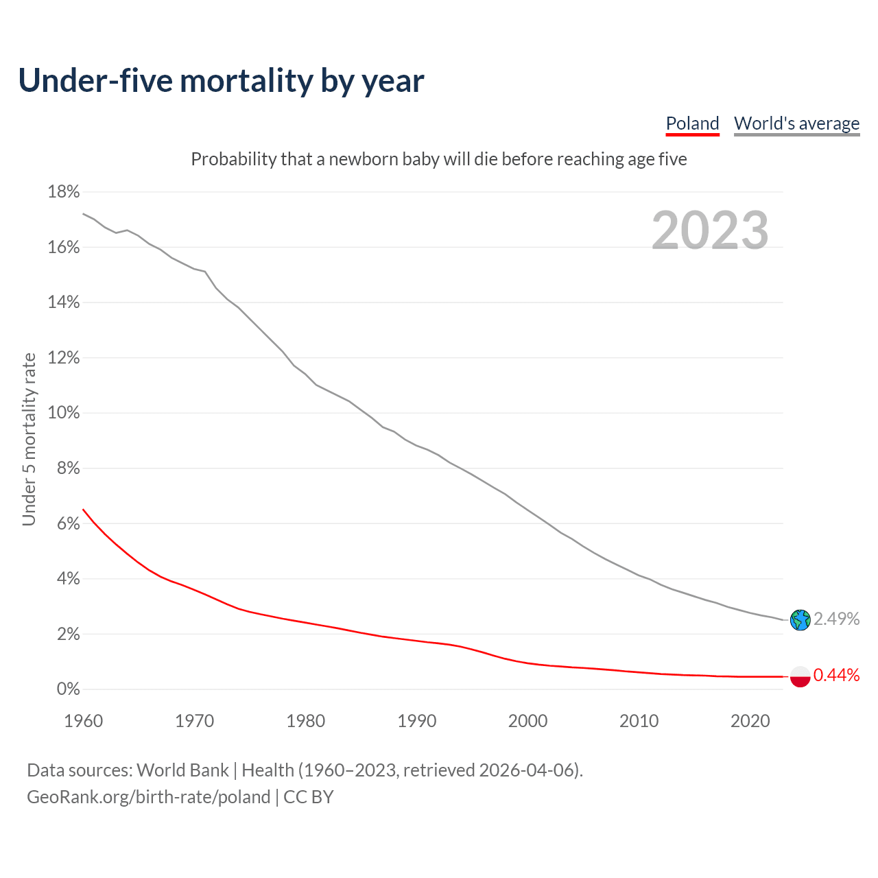 The under-5 mortality rate in Poland was 4.4 deaths per 1,000 live births in 2023 — a 0.44% chance that a newborn baby will die before reaching age five. This is down from 9.3 deaths per 1,000 live births in 2000.