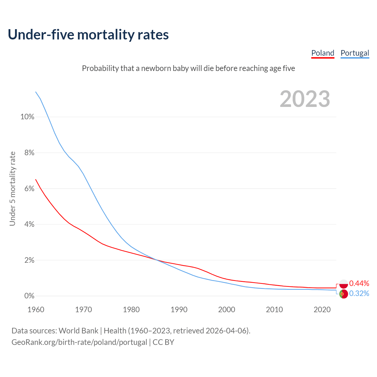 The chance that a newborn baby will die before reaching age five is 0.44% in Poland and 0.32% in Portugal. Above is a chart with historical data on under-five mortality rates.
