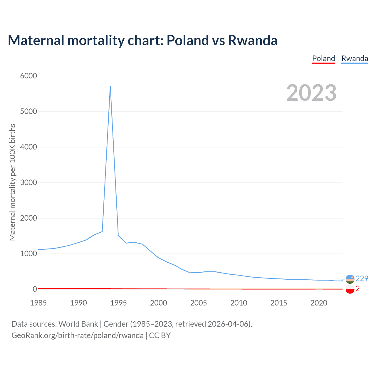 The maternal mortality rate, which is the probability of dying during childbirth or within 42 days of pregnancy termination, is 2 deaths per 100,000 live births in Poland, compared to 229 deaths in Rwanda.