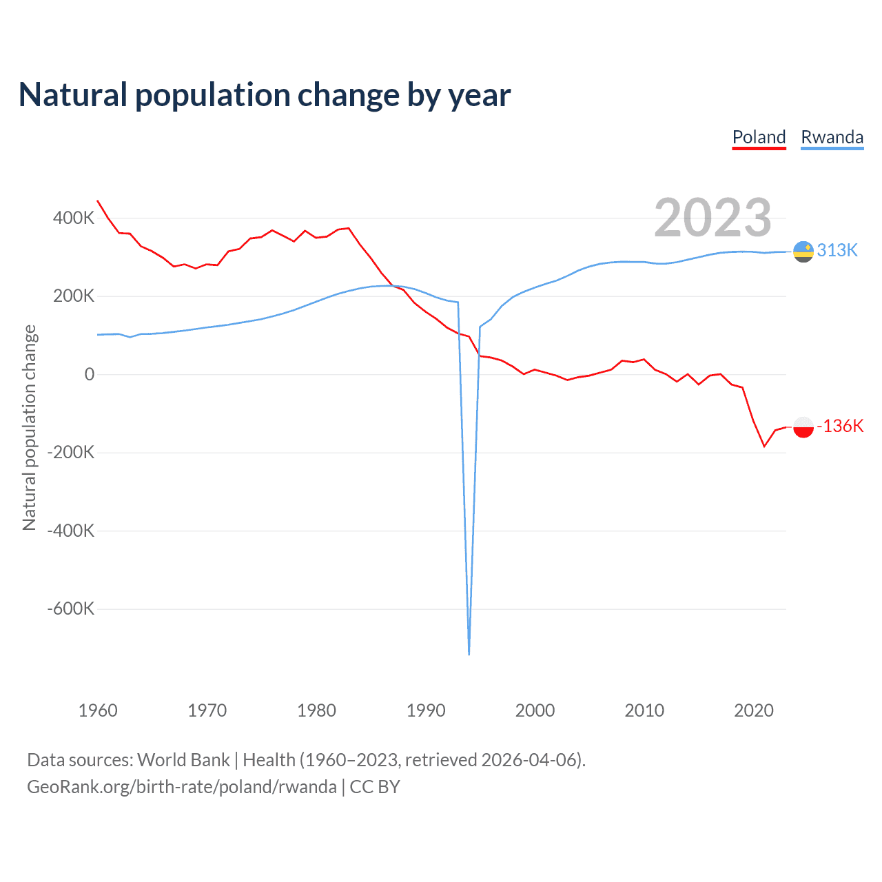 Poland has an annual birth rate of 7.4 births per 1,000 people, compared to 28.3 for Rwanda. The average number of children a woman is expected to have during her lifetime — the fertility rate, is 1.16 in Poland and 3.7 in Rwanda — 219.3% difference.
