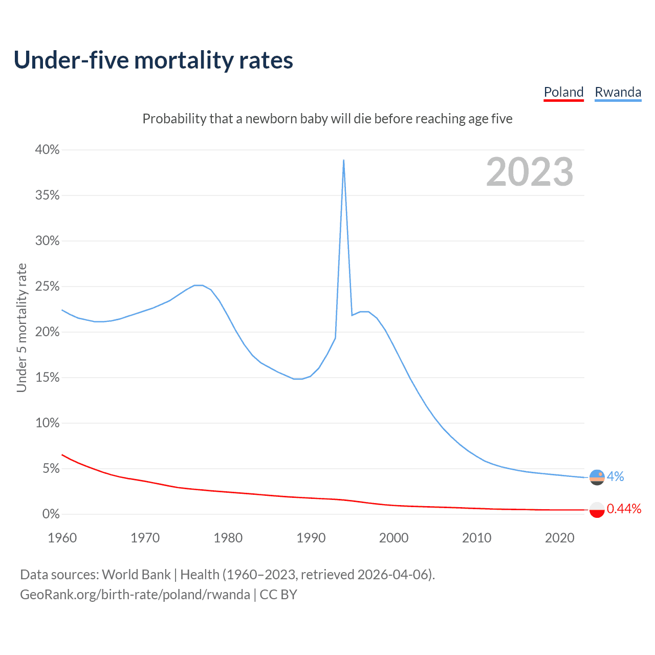 The chance that a newborn baby will die before reaching age five is 0.44% in Poland and 4% in Rwanda. Above is a chart with historical data on under-five mortality rates.