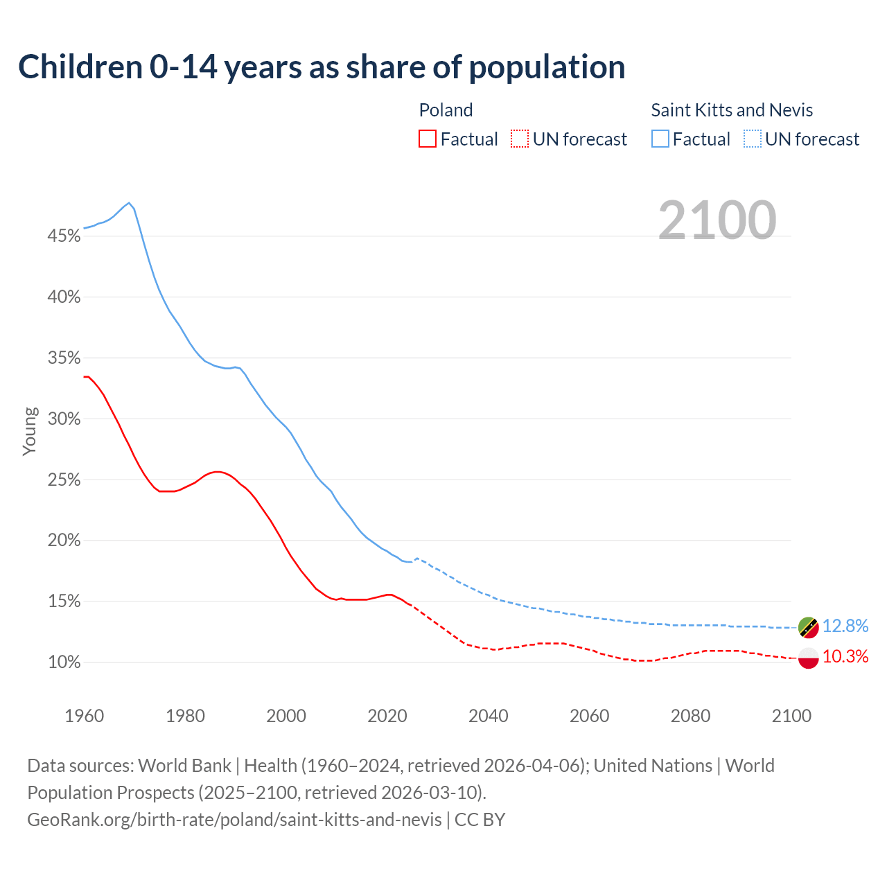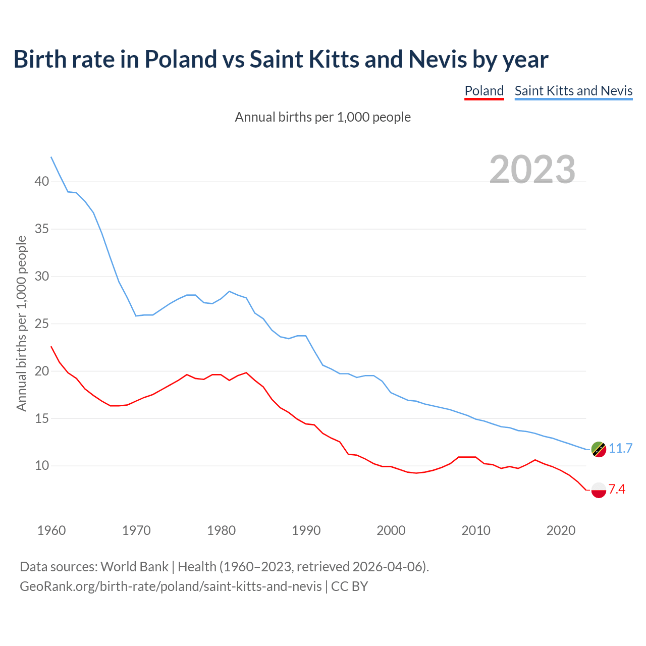 Poland has an annual birth rate of 7.4 births per 1,000 people, compared to 11.7 for Saint Kitts and Nevis. The average number of children a woman is expected to have during her lifetime — the fertility rate, is 1.16 in Poland and 1.51 in Saint Kitts and Nevis — 30% difference.