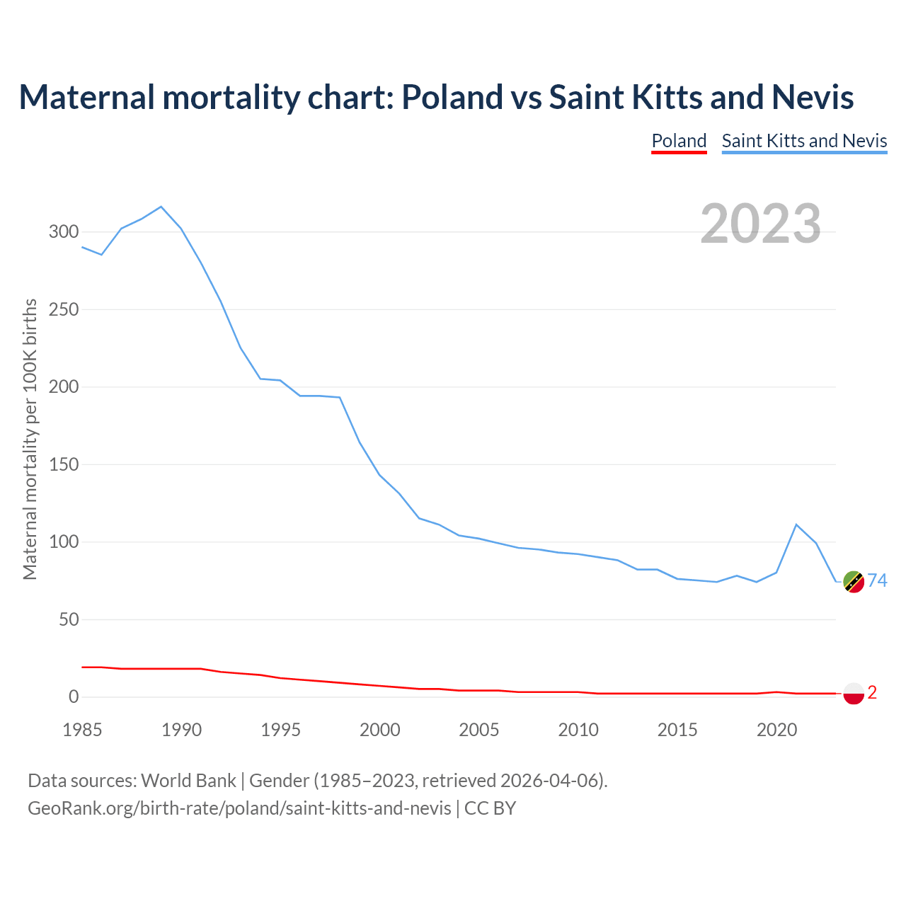 The maternal mortality rate, which is the probability of dying during childbirth or within 42 days of pregnancy termination, is 2 deaths per 100,000 live births in Poland, compared to 74 deaths in Saint Kitts and Nevis.