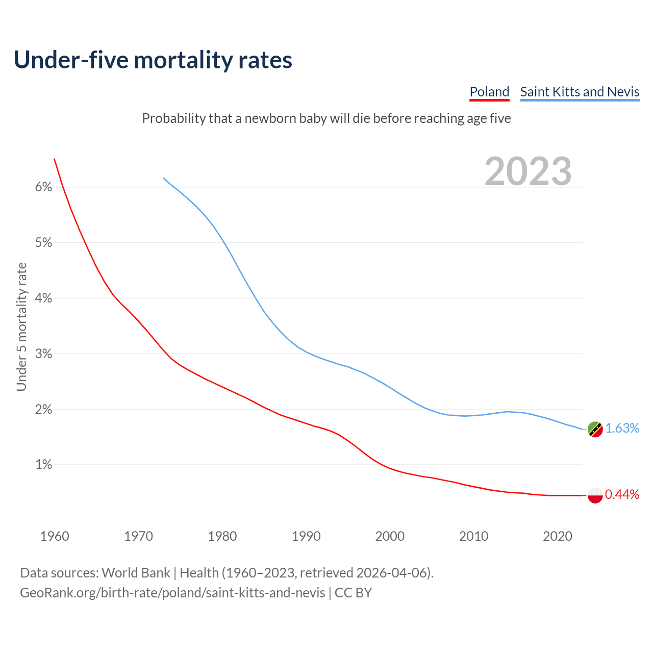 The chance that a newborn baby will die before reaching age five is 0.44% in Poland and 1.63% in Saint Kitts and Nevis. Above is a chart with historical data on under-five mortality rates.