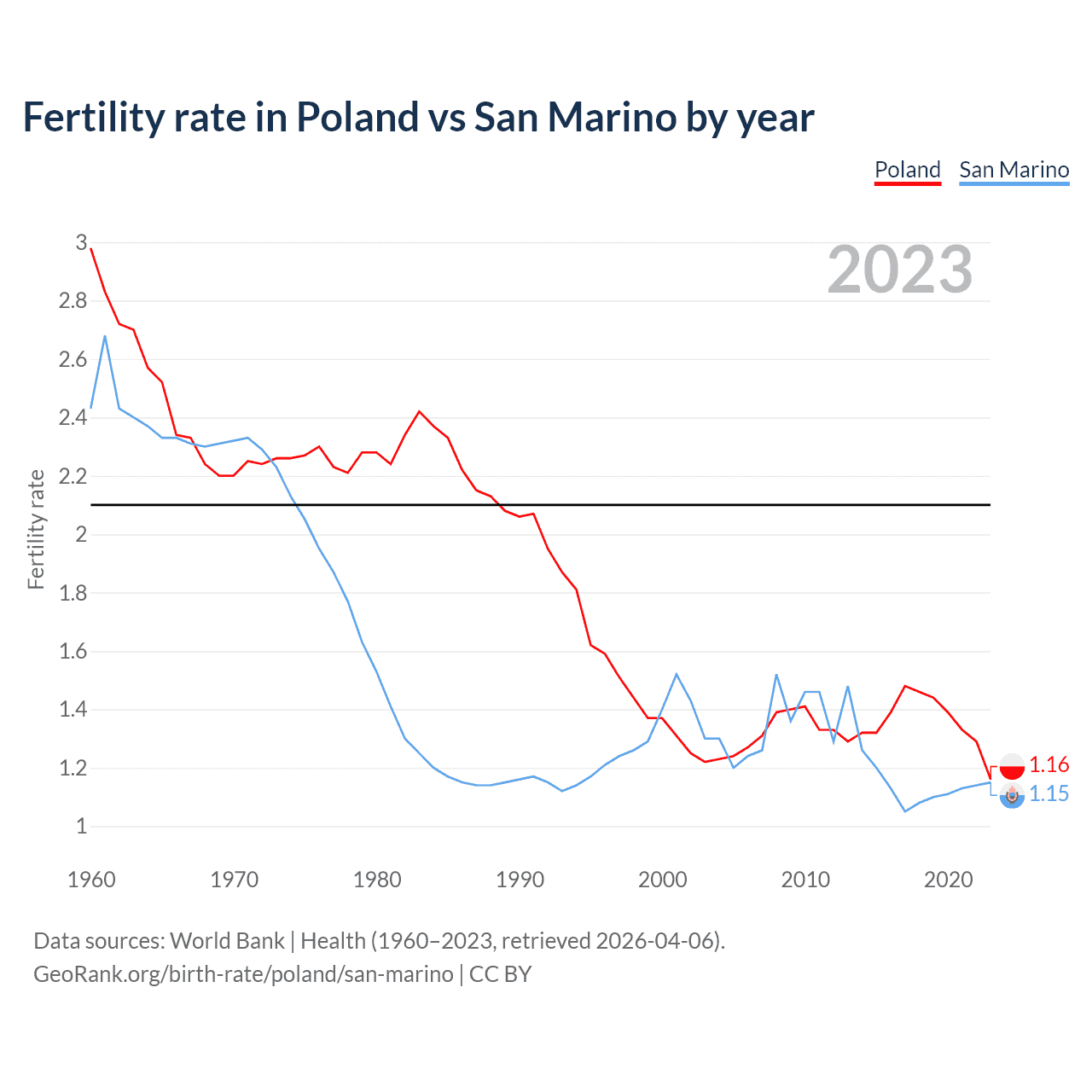 According to the latest available data on birth rates, the fertility rate in Poland was 1.16 children per woman in 2023, compared to 1.15 in San Marino in 2023. The replacement level is considered to be 2.1 children per woman.