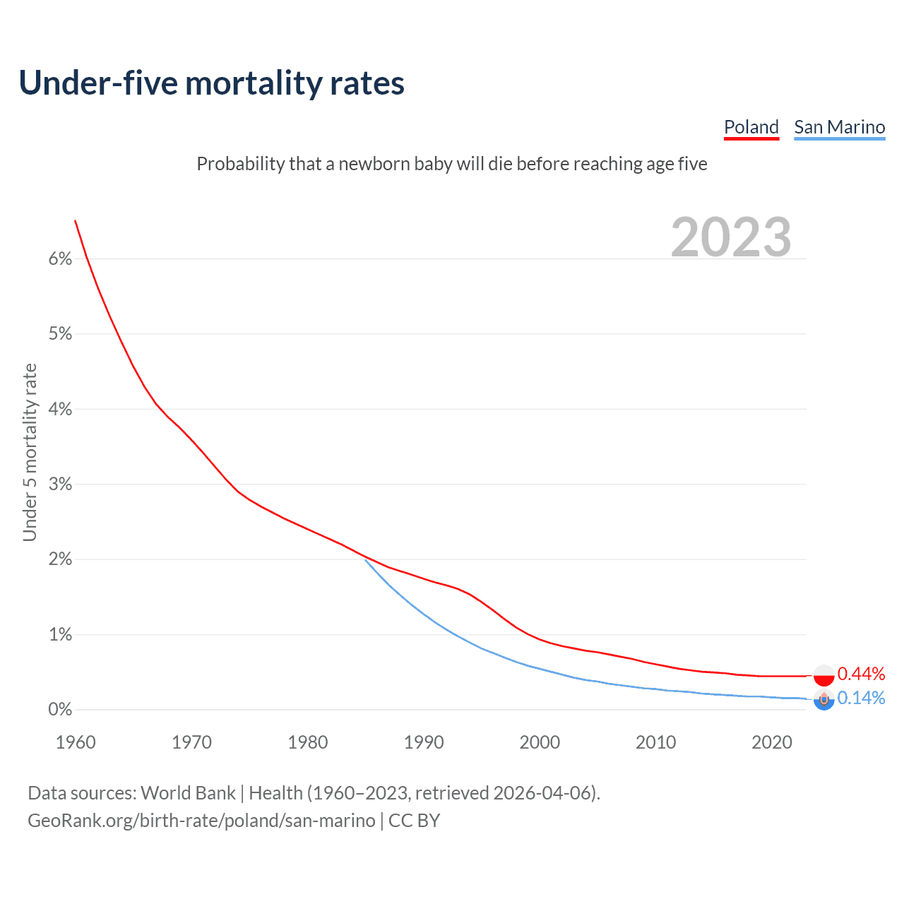 The chance that a newborn baby will die before reaching age five is 0.44% in Poland and 0.14% in San Marino. Above is a chart with historical data on under-five mortality rates.