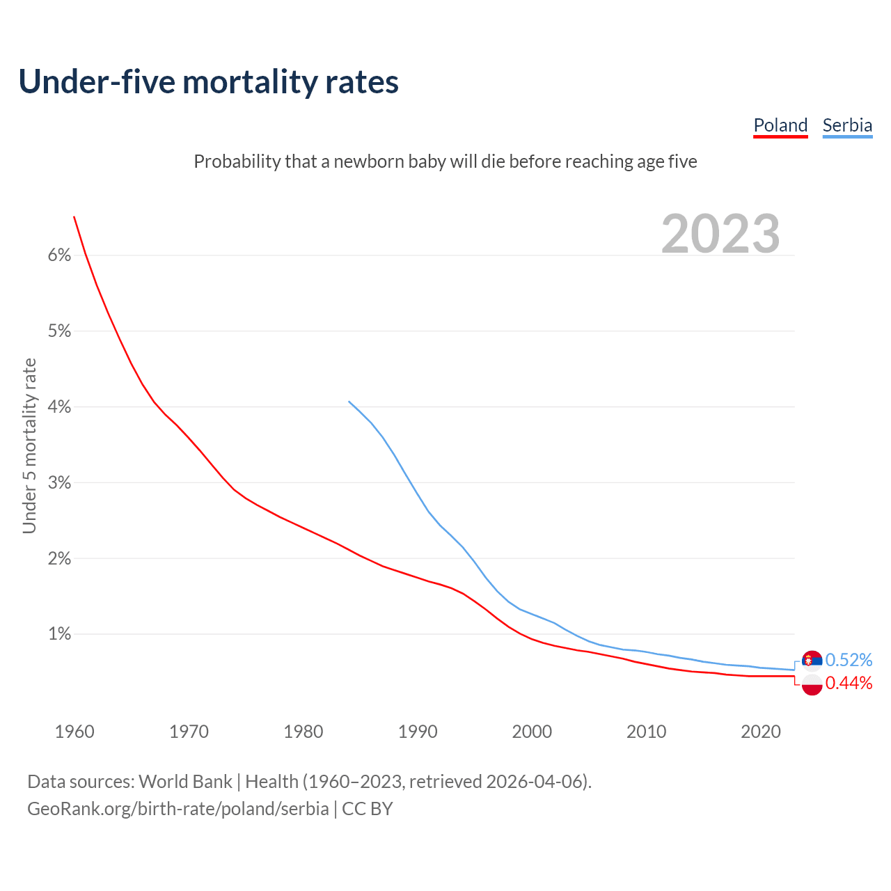 The chance that a newborn baby will die before reaching age five is 0.44% in Poland and 0.52% in Serbia. Above is a chart with historical data on under-five mortality rates.