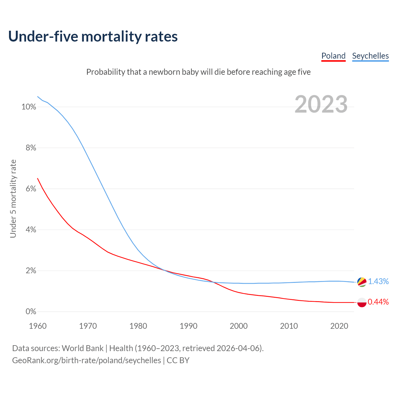 The chance that a newborn baby will die before reaching age five is 0.44% in Poland and 1.43% in the Seychelles. Above is a chart with historical data on under-five mortality rates.