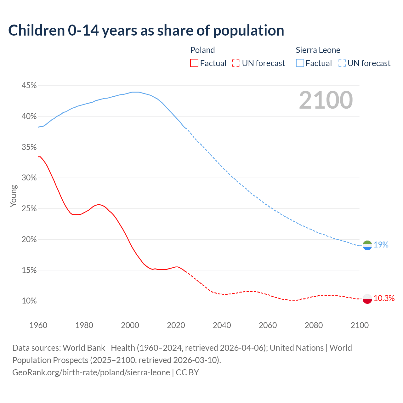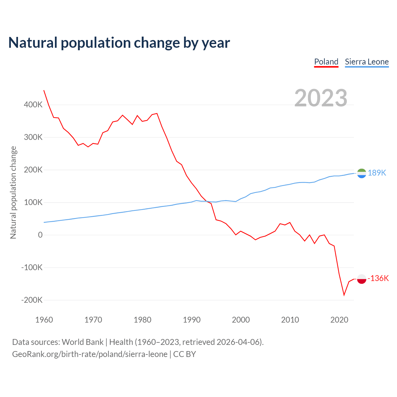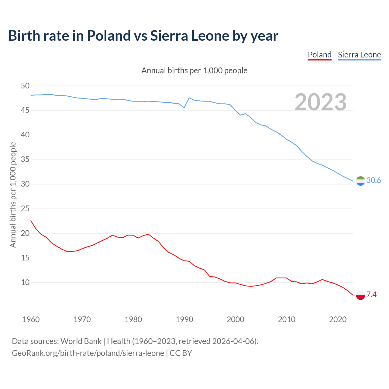 Poland has an annual birth rate of 7.4 births per 1,000 people, compared to 30.6 for Sierra Leone. The average number of children a woman is expected to have during her lifetime — the fertility rate, is 1.16 in Poland and 3.79 in Sierra Leone — 227.4% difference.