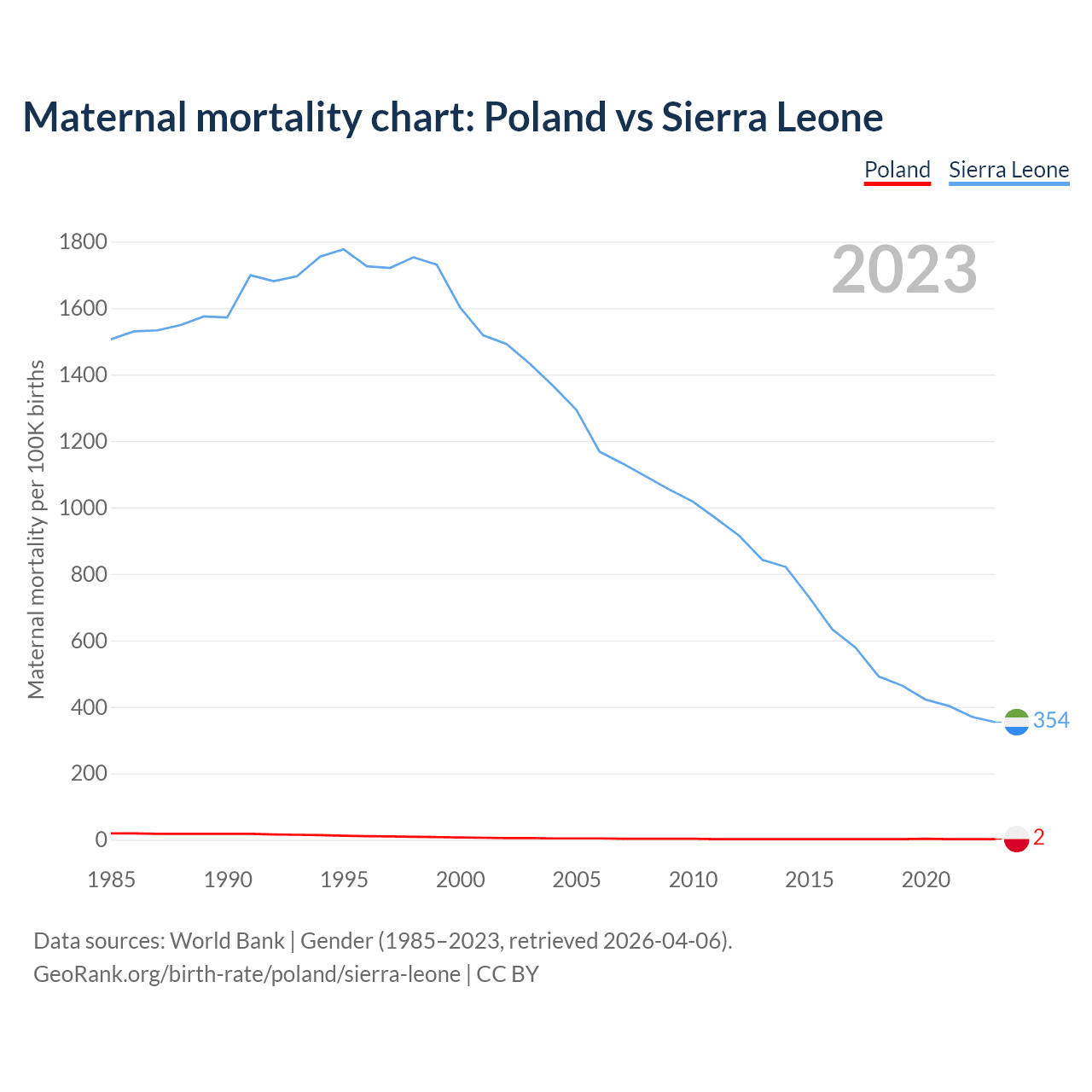 The maternal mortality rate, which is the probability of dying during childbirth or within 42 days of pregnancy termination, is 2 deaths per 100,000 live births in Poland, compared to 354 deaths in Sierra Leone.