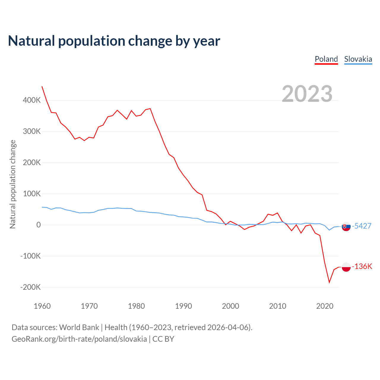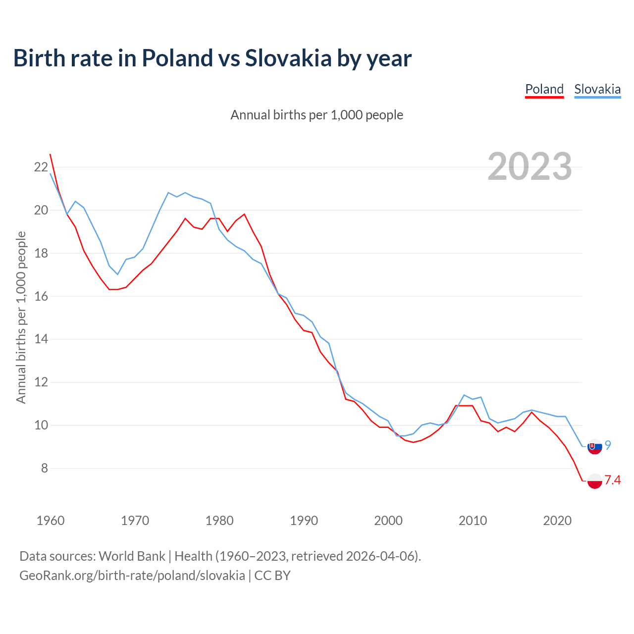 According to the latest available data on birth rates, the fertility rate in Poland was 1.16 children per woman in 2023, compared to 1.49 in Slovakia in 2023. The replacement level is considered to be 2.1 children per woman.