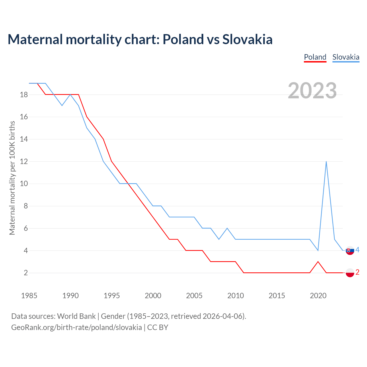 The maternal mortality rate, which is the probability of dying during childbirth or within 42 days of pregnancy termination, is 2 deaths per 100,000 live births in Poland, compared to 4 deaths in Slovakia.