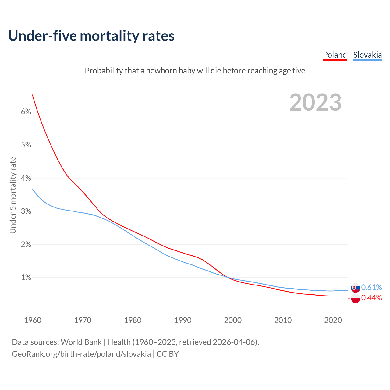 The chance that a newborn baby will die before reaching age five is 0.44% in Poland and 0.61% in Slovakia. Above is a chart with historical data on under-five mortality rates.