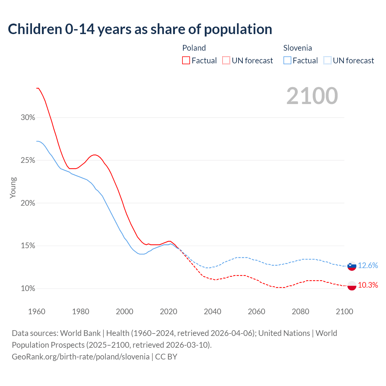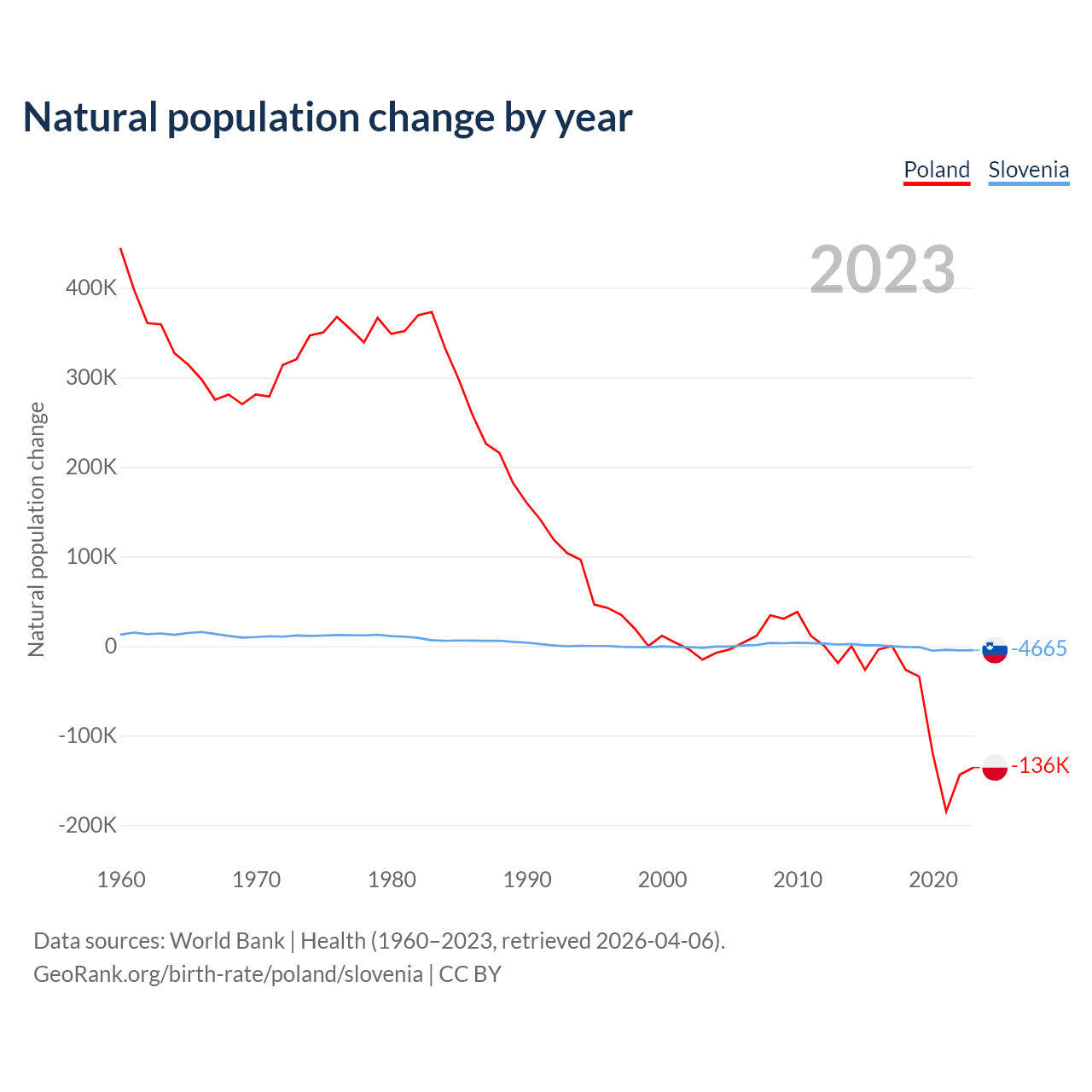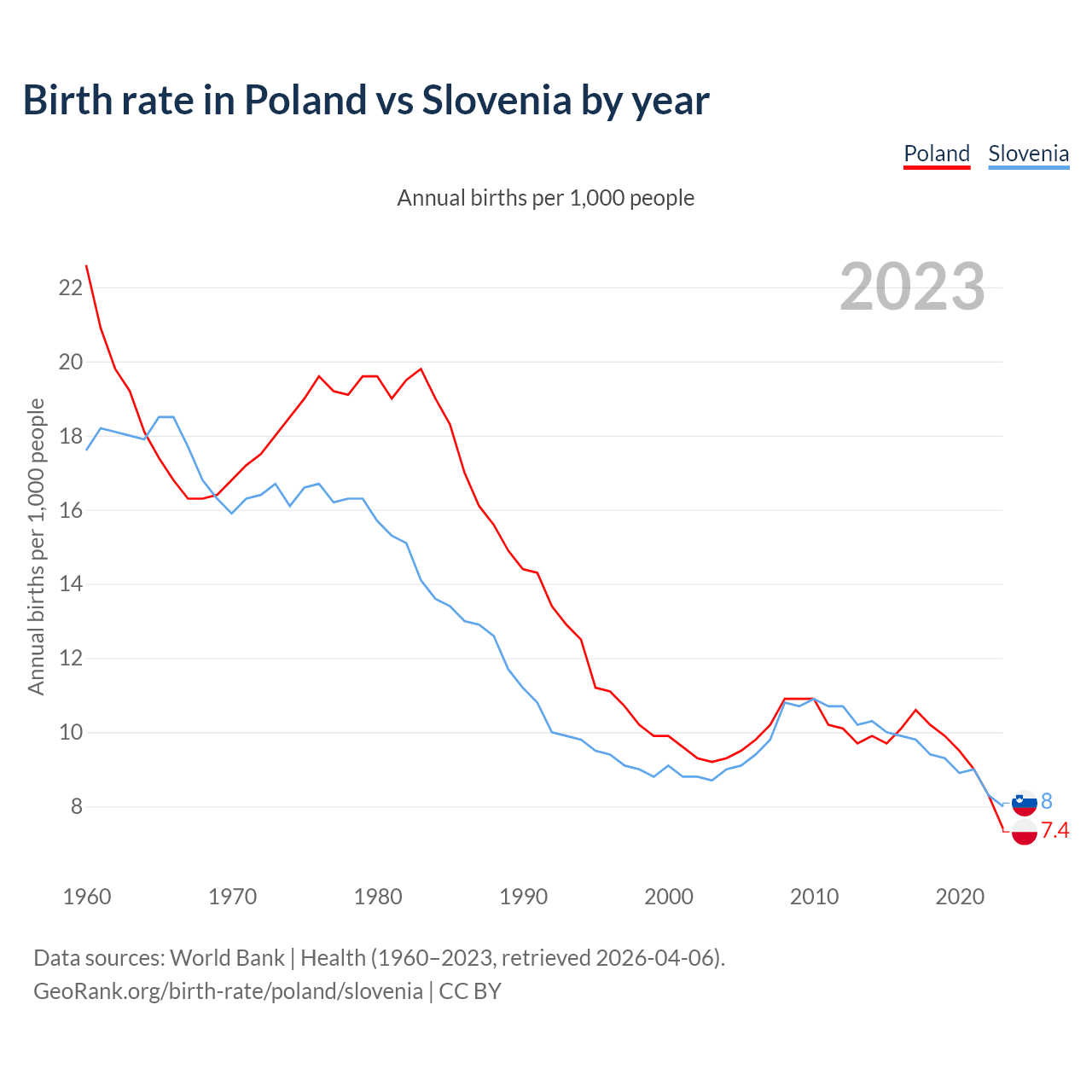 According to the latest available data on birth rates, the fertility rate in Poland was 1.16 children per woman in 2023, compared to 1.51 in Slovenia in 2023. The replacement level is considered to be 2.1 children per woman.