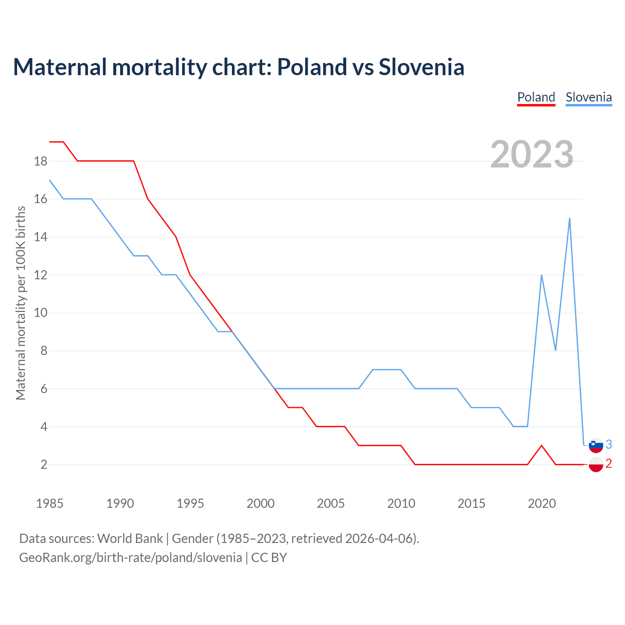 The maternal mortality rate, which is the probability of dying during childbirth or within 42 days of pregnancy termination, is 2 deaths per 100,000 live births in Poland, compared to 3 deaths in Slovenia.