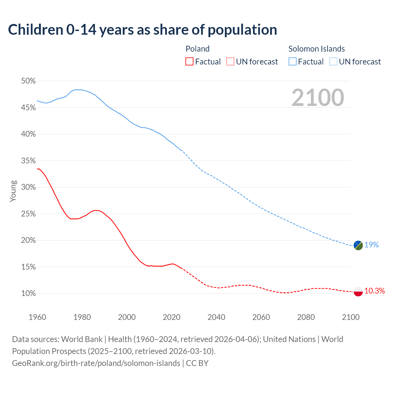 Poland has an annual birth rate of 7.4 births per 1,000 people, compared to 26.9 for the Solomon Islands. The average number of children a woman is expected to have during her lifetime — the fertility rate, is 1.16 in Poland and 3.56 in the Solomon Islands — 207.2% difference.