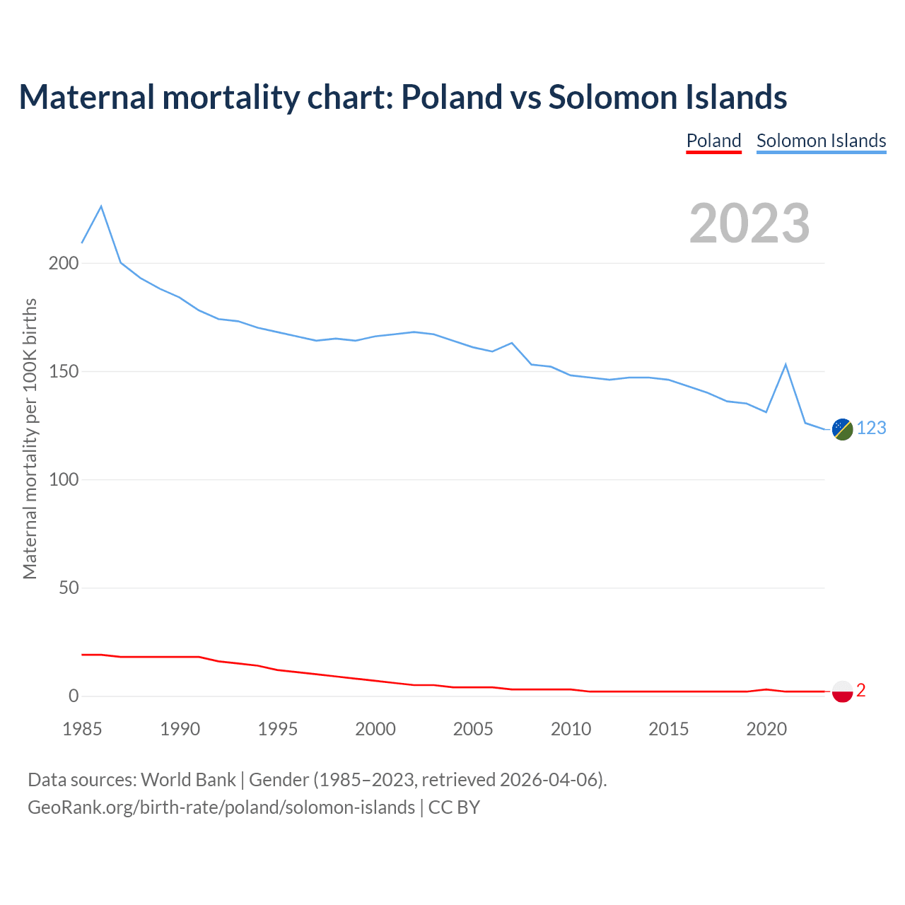 The maternal mortality rate, which is the probability of dying during childbirth or within 42 days of pregnancy termination, is 2 deaths per 100,000 live births in Poland, compared to 123 deaths in the Solomon Islands.