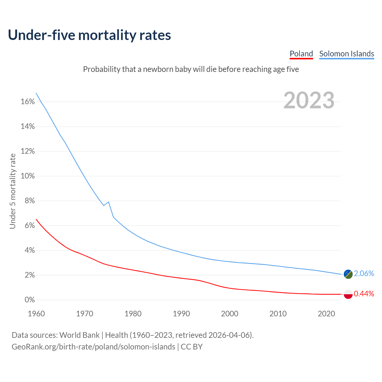 The chance that a newborn baby will die before reaching age five is 0.44% in Poland and 2.06% in the Solomon Islands. Above is a chart with historical data on under-five mortality rates.