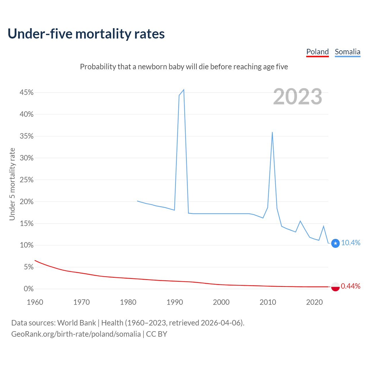 The chance that a newborn baby will die before reaching age five is 0.44% in Poland and 10.4% in Somalia. Above is a chart with historical data on under-five mortality rates.