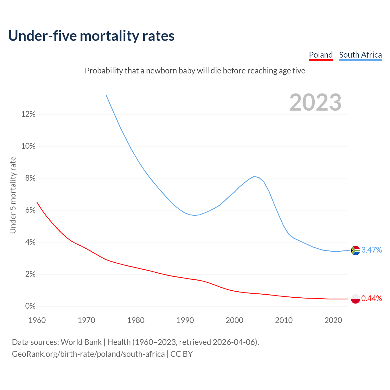 The chance that a newborn baby will die before reaching age five is 0.44% in Poland and 3.47% in South Africa. Above is a chart with historical data on under-five mortality rates.