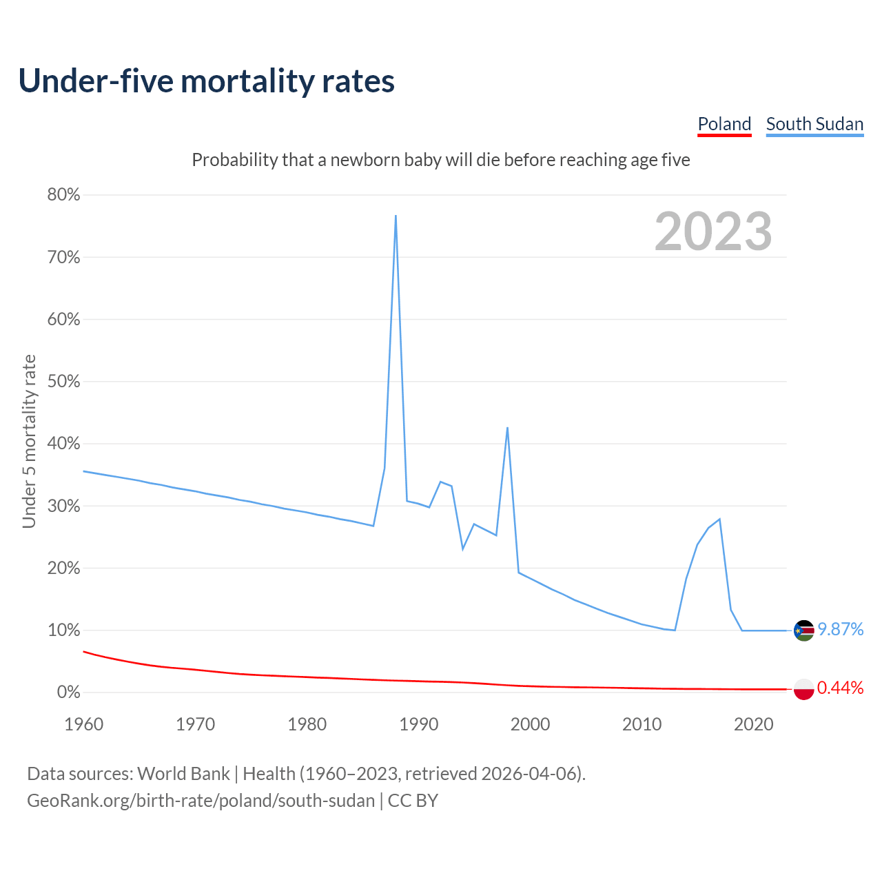 The chance that a newborn baby will die before reaching age five is 0.44% in Poland and 9.87% in South Sudan. Above is a chart with historical data on under-five mortality rates.
