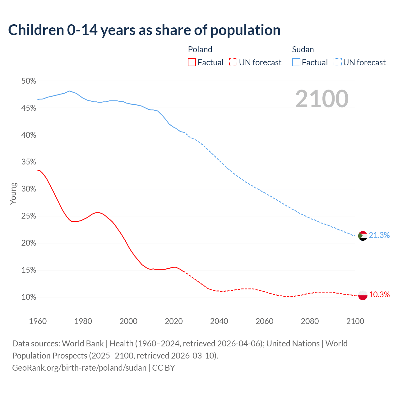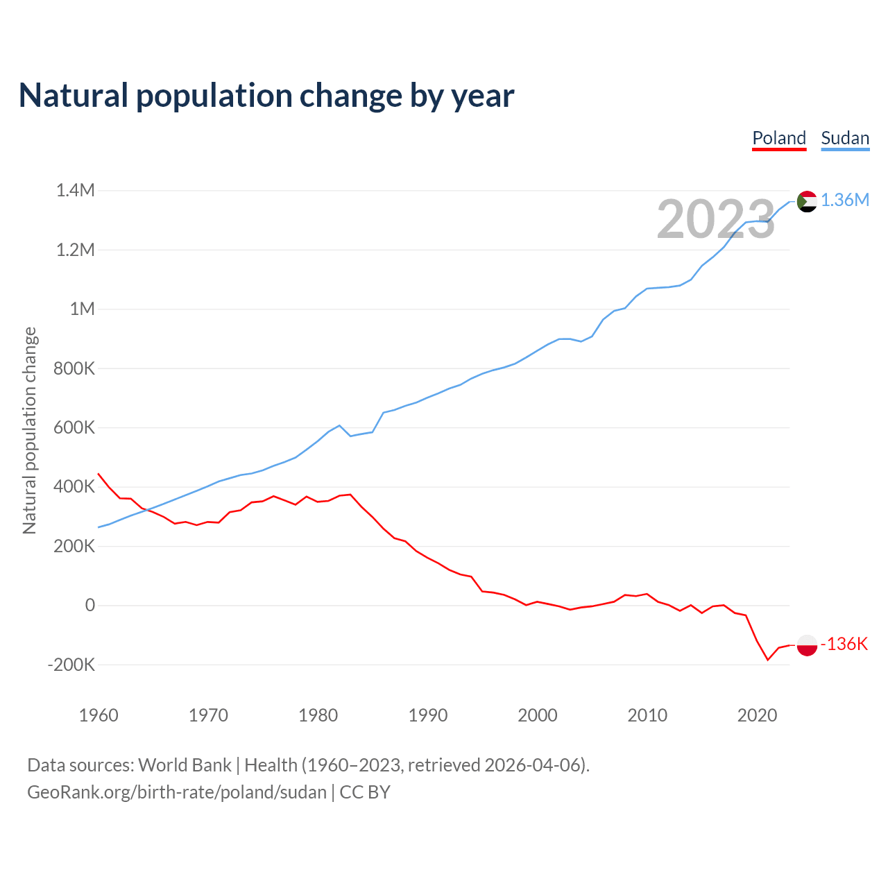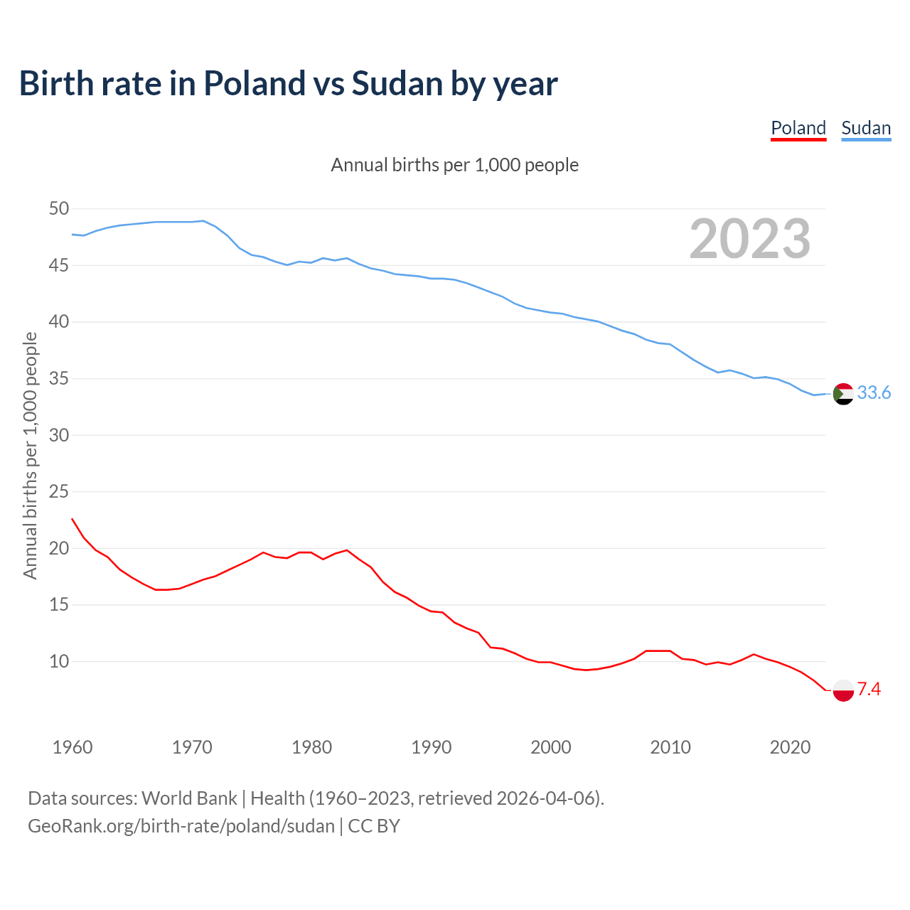 Poland has an annual birth rate of 7.4 births per 1,000 people, compared to 33.6 for Sudan. The average number of children a woman is expected to have during her lifetime — the fertility rate, is 1.16 in Poland and 4.32 in Sudan — 273.3% difference.