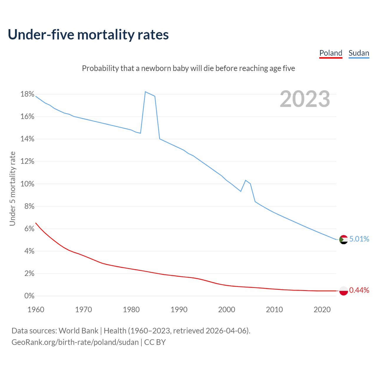 The chance that a newborn baby will die before reaching age five is 0.44% in Poland and 5.01% in Sudan. Above is a chart with historical data on under-five mortality rates.