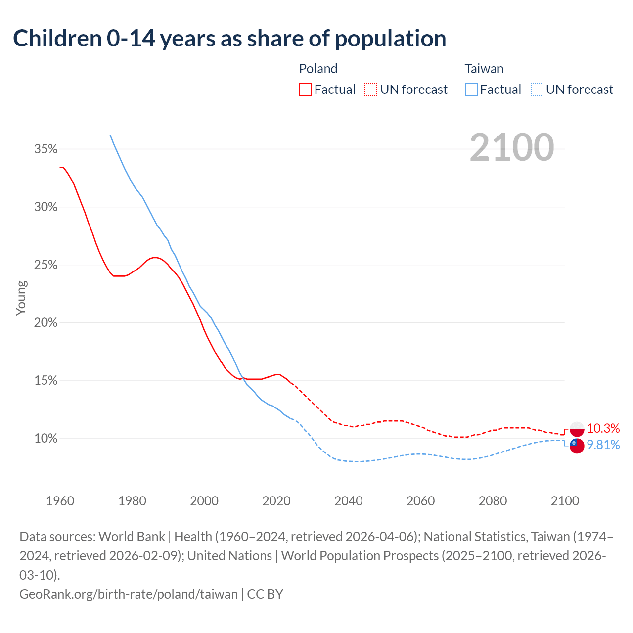Children aged 0-14 make up 14.8% of the population in Poland and 11.7% in Taiwan in 2024, compared to 25% and 27.1% respectively in 1990.