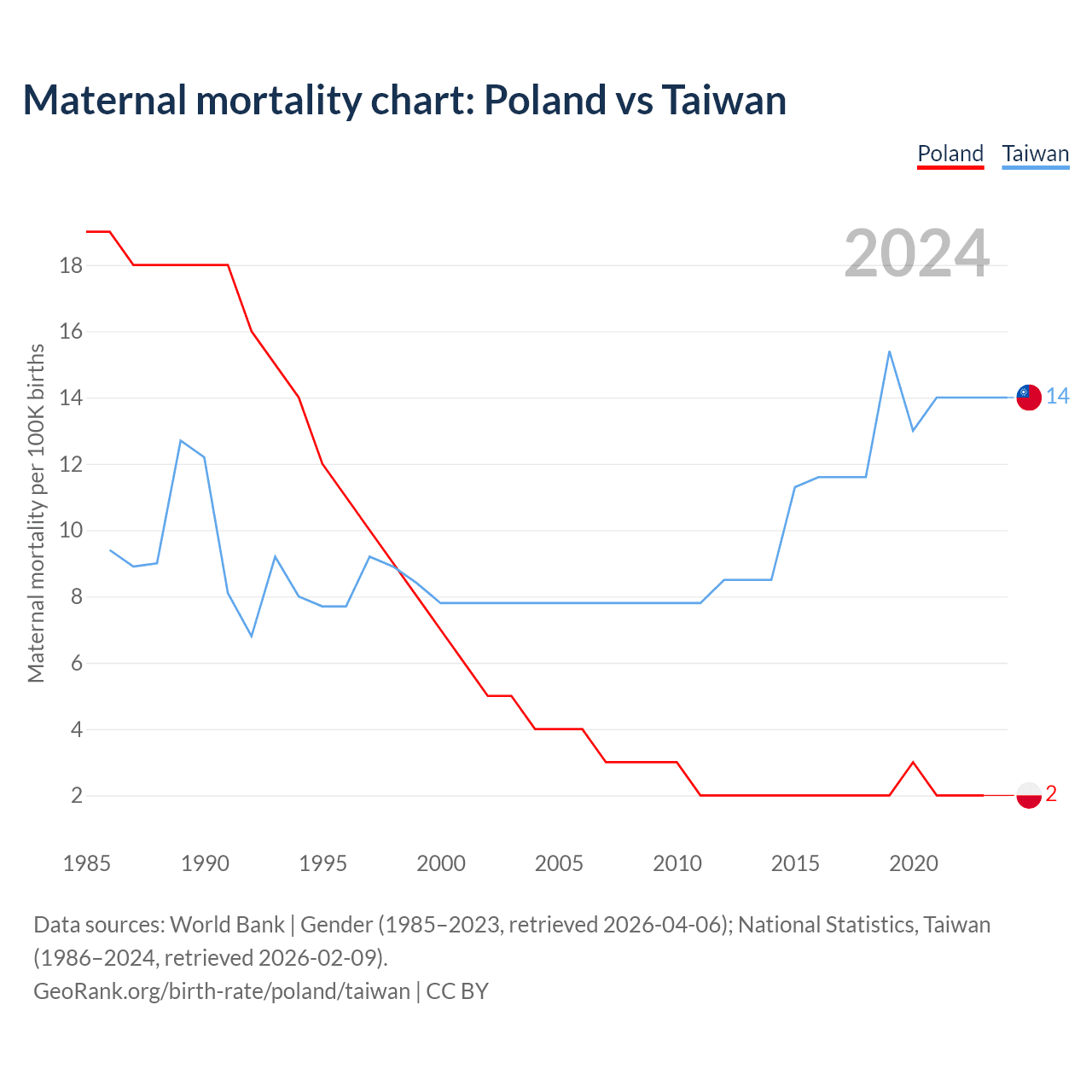 The maternal mortality rate, which is the probability of dying during childbirth or within 42 days of pregnancy termination, is 2 deaths per 100,000 live births in Poland, compared to 14 deaths in Taiwan.
