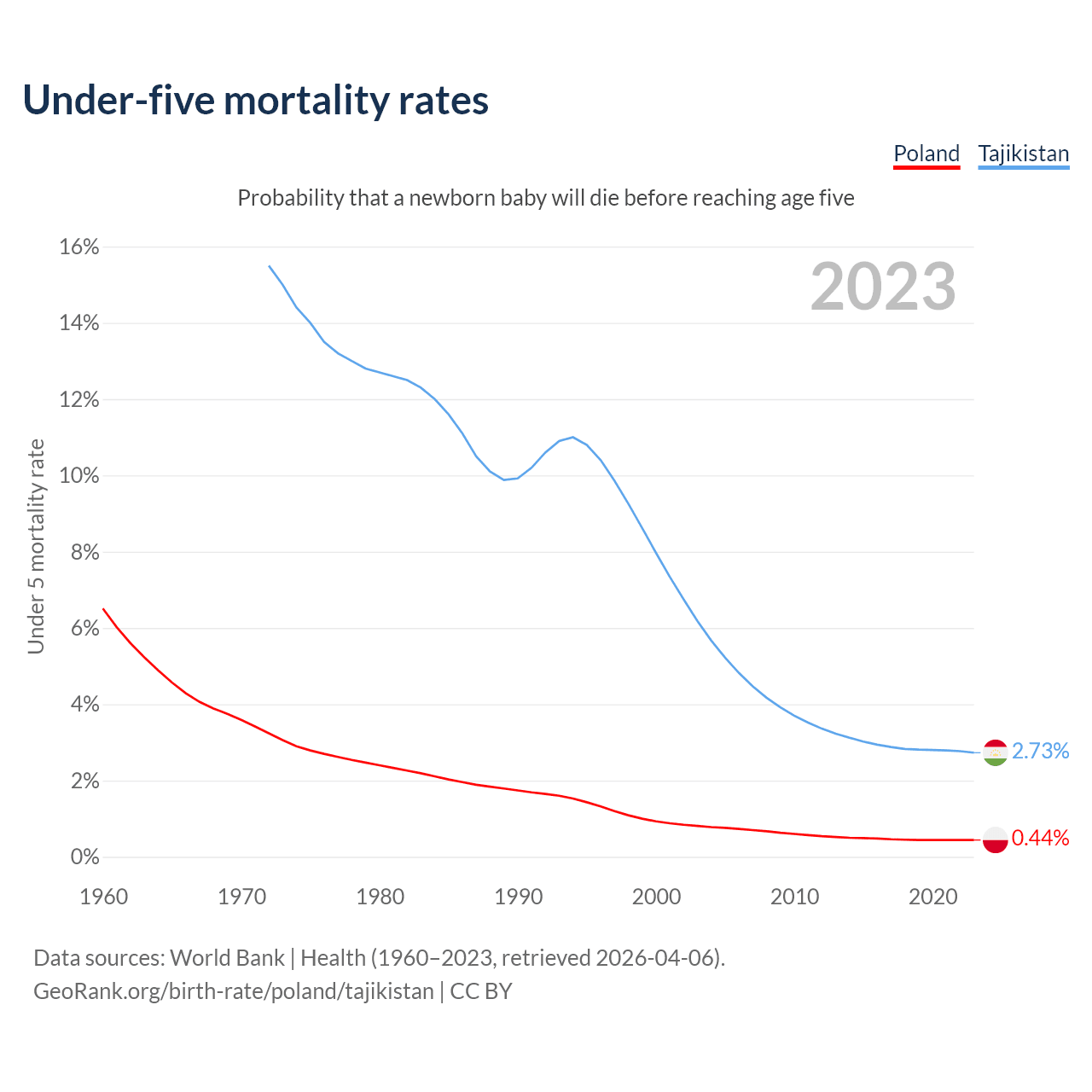 The chance that a newborn baby will die before reaching age five is 0.44% in Poland and 2.73% in Tajikistan. Above is a chart with historical data on under-five mortality rates.