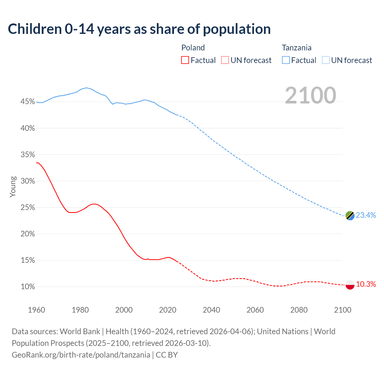 Poland has an annual birth rate of 7.4 births per 1,000 people, compared to 35.2 for Tanzania. The average number of children a woman is expected to have during her lifetime — the fertility rate, is 1.16 in Poland and 4.61 in Tanzania — 297.8% difference.