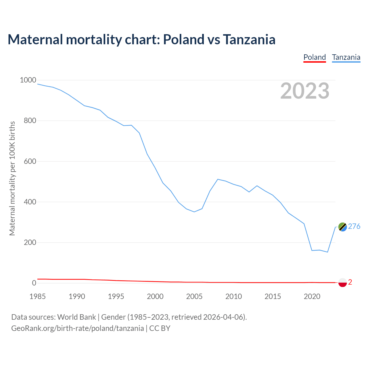 The maternal mortality rate, which is the probability of dying during childbirth or within 42 days of pregnancy termination, is 2 deaths per 100,000 live births in Poland, compared to 276 deaths in Tanzania.