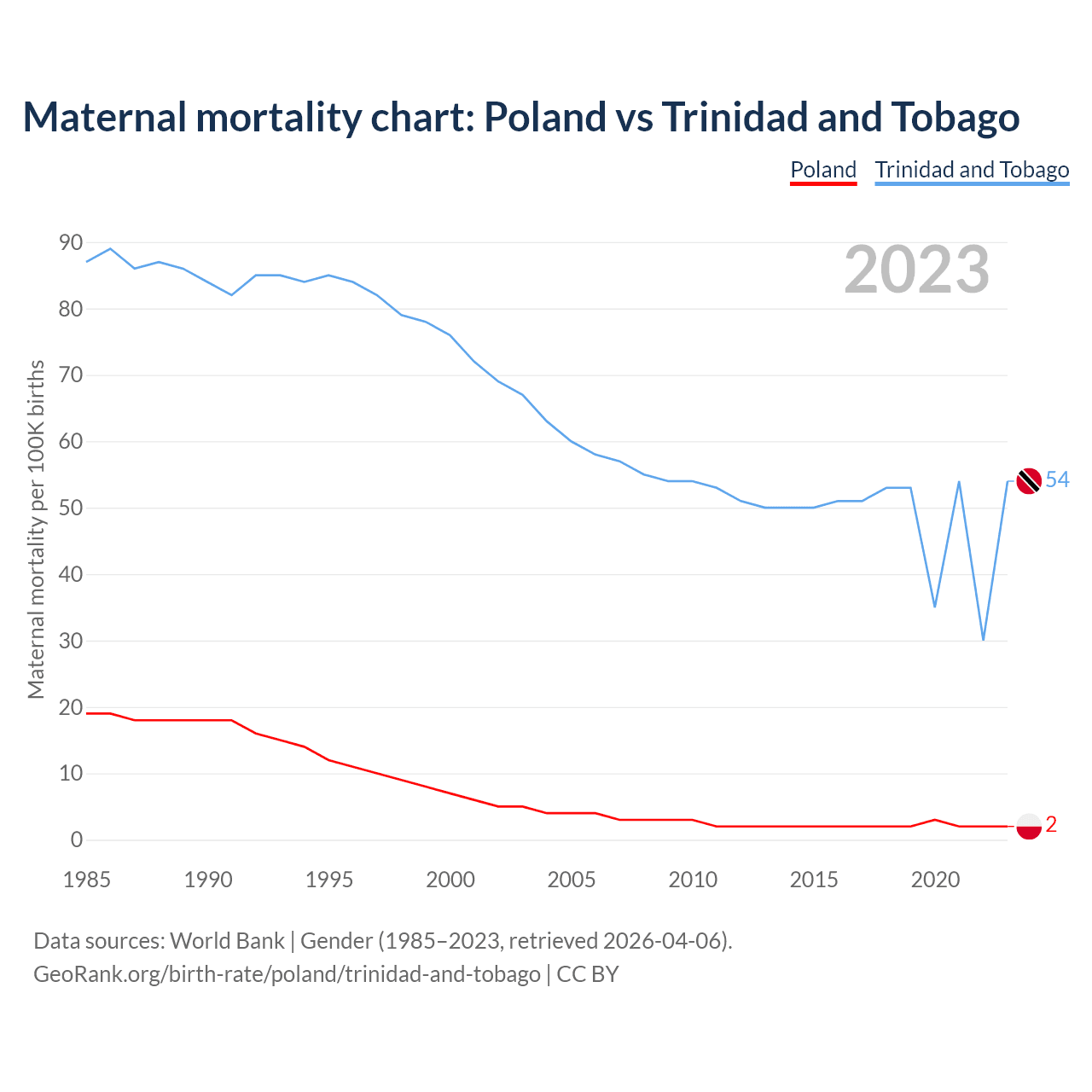The maternal mortality rate, which is the probability of dying during childbirth or within 42 days of pregnancy termination, is 2 deaths per 100,000 live births in Poland, compared to 54 deaths in Trinidad and Tobago.