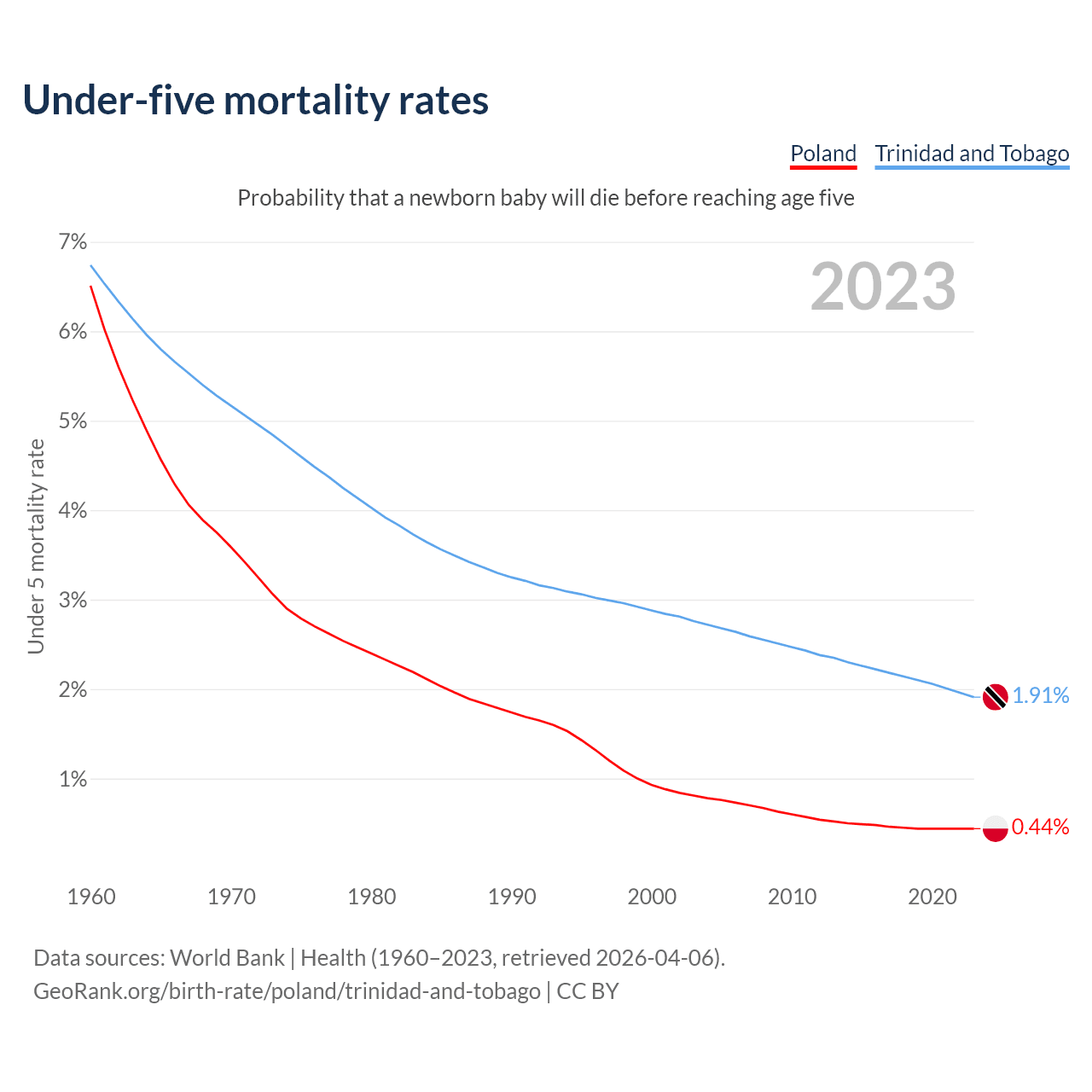 The chance that a newborn baby will die before reaching age five is 0.44% in Poland and 1.91% in Trinidad and Tobago. Above is a chart with historical data on under-five mortality rates.