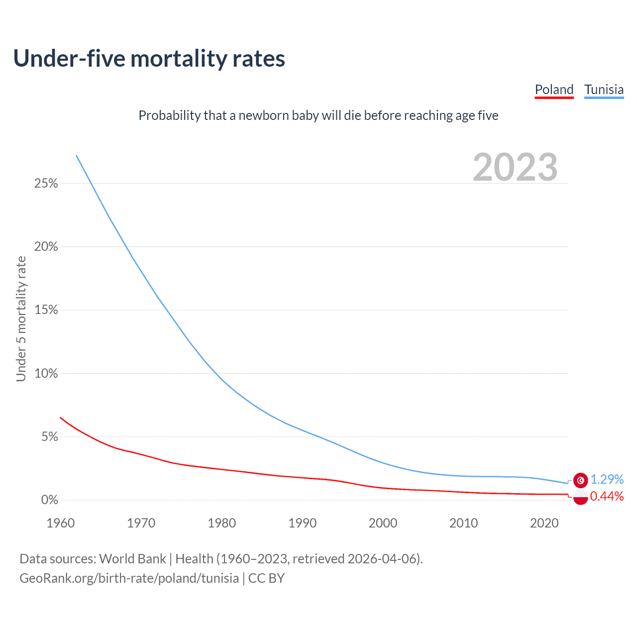 The chance that a newborn baby will die before reaching age five is 0.44% in Poland and 1.29% in Tunisia. Above is a chart with historical data on under-five mortality rates.